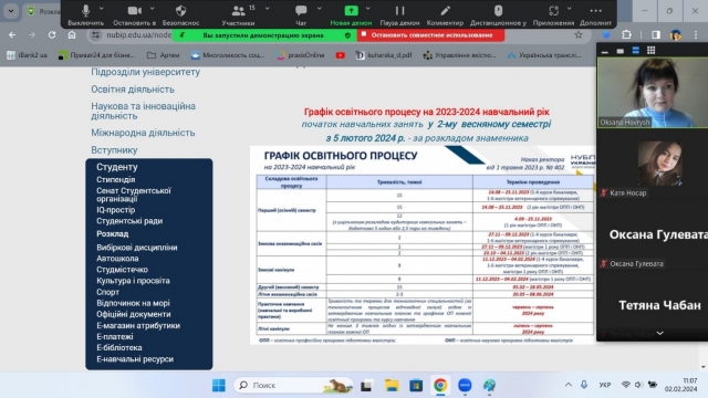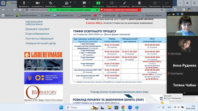 Під час зустрічі Оксана Миколаївна поцікавилася станом здоров’я студентів та готовністю кожного відвідувати заняття в режимі офлайн. Окрему увагу було приділено графіку освітнього процесу в другому семестрі 2023/2024 н. р. для студентів денної форми навчання та розкладу навчальних занять. Оксана Гавриш наголосила здобувачам вищої освіти на правилах поведінки під час сигналу «Повітряна тривога» та провела інструкцію з дотримання правил поведінки в умовах воєнного стану в Україні та протиепідемічних заходів під час організації освітнього процесу в НУБіП України.