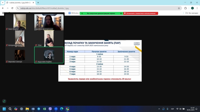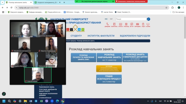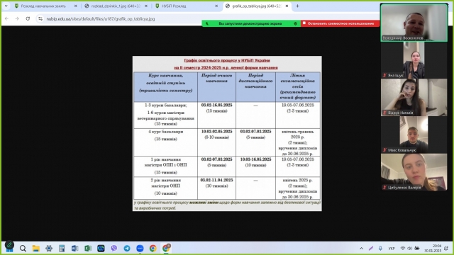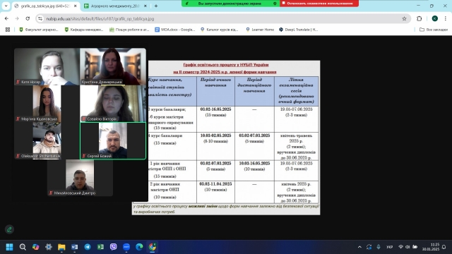 03 лютого 2025 року згідно наказу від 28.11.2024 р. № 1371 на всіх факультетах та ННІ університету за розкладом чисельника розпочинаються навчальні заняття весняного семестру 2024-2025 навчального року Перед початком навчання, для обговорення важливих питань, в онлайн-режимі відбулися зустрічі здобувачів вищої освіти факультету аграрного менеджменту з наставниками академічних груп: старшим викладачем кафедри менеджменту ім. проф. Й. С. Завадського Володимиром Восколуповим і доцентом кафедри менеджменту ім. проф. Й. С. Завадського Кристиною Драмарецькою. Під час зустрічі зі студентами 4 курсу 3 групи Володимир Віталійович поцікавився насамперед станом їхнього здоров’я. Окрему увагу було приділено графіку освітнього процесу в другому семестрі 2024/2025 н. р. для студентів денної форми навчання та розкладу навчальних занять. Наставник групи наголосив здобувачам вищої освіти випускового курсу про терміни, особливості підготовки і безпосередньо виконання бакалаврських кваліфікаційних робіт, як одного із важливих підсумкових етапів навчальної складової.