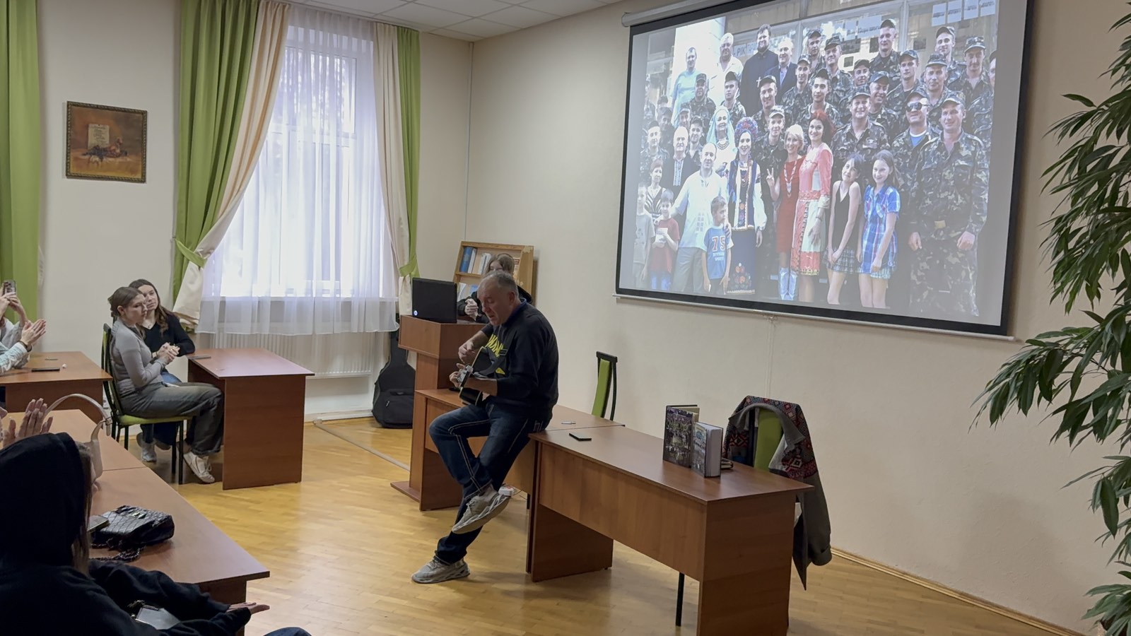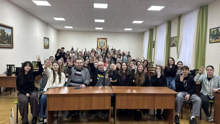 Під кінець зустрічі Володимир Васильович знову взяв до рук гітару і вся авдиторія заспівала нашу рідну «Червону руту», коли ми виконували пісню у кімнаті відчувалось сімейне тепло та затишок, ми були об’єднані піснею, а саме такі люди як пан Володимир є рушійною силою цього об’єднання. Варто зазначити, що студентам випала можливість почути його авторську пісню «І все ж, люби життя!», не було жодного студента кого б вона не торкалась, вона про прийняття того, що маєш, про те, що варто радіти просто тому, що живеш.