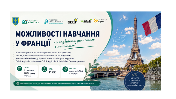 Шановні студенти, ми раді запросити вас на інформаційну зустріч, присвячену можливостям навчання по подвійним дипломама і не тільки, у Франції в межах співпраці з групою Crédit Agricole та Фондом Crédit Agricole Solidarité et Développement.
