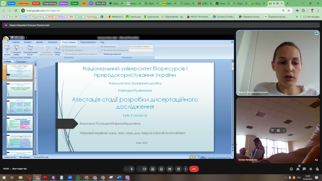 26 червня 2025 року на кафедрі будівництва Національного університету біоресурсів і природокористування України відбулася успішна атестація аспірантів, які навчаються за спеціальністю 192 "Будівництво та цивільна інженерія". Підсумкове засідання атестаційної комісії підтвердило високий рівень наукових досягнень молодих дослідників кафедри.