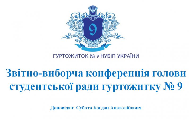 22 вересня 2015 року в 18-00 в читальному залі Гуртожитку №9 НУБіП України відбувся знаменний захід «Звітно-виборча конференція: Звіт голови студентської ради гуртожитку №9 – Суботи Богдана за звітний період роботи та вибори нового голови студентської ради гуртожитку №9.