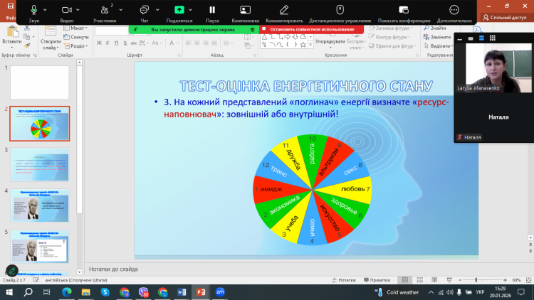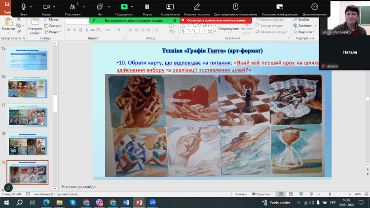У межах кафедрального проєкту «Зимова школа юного психолога» 20 січня 2026 року доцент кафедри психології Лариса Афанасенко провела заняття на тему «Мій життєвий вибір: потаємність чи відповідальність», присвячене осмисленню особистих рішень та їхніх наслідків. Учасники через інтерактивні вправи та обговорення замислювалися над межами приватності, формуванням відповідальності й усвідомленого вибору як складника дорослішання. Зустріч сприяла розвитку саморефлексії, емоційної зрілості та забезпечила популяризацію психологічної науки.