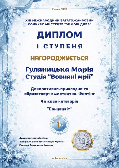 Студія «Вовняні мрії» під керівництвом викладача Наталії ГОЛОВАТОЇ наймолодша на кафедрі, проте успіхи її учасниць — блискучі! Особливої уваги заслуговує Марія ГУЛЯНИЦЬКА, яка почала навчатися у студії, як то кажуть, «з нуля», а нещодавно отримала блискучі перемоги на V Всеукраїнському двотуровому фестивалі-конкурсі мистецтв «Різдвяна Україна» та ХІІІ Міжнародному багатожанровому конкурсі мистецтв «Зимові дива» ! Її робота, виконана у неймовірно ніжній та складній техніці — малюнок вовною, вразила журі своєю глибиною та майстерністю. Це не просто картина, це втілення тепла, терпіння та справжнього таланту.