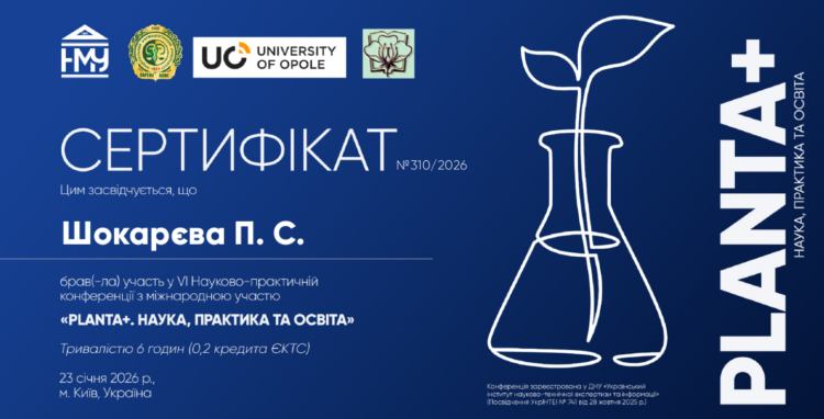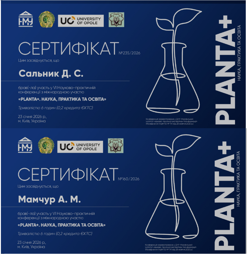 23 січня 2026 року здобувачі наукового гуртка кафедри фізіології хребетних і фармакології Діана Сальник, Поліна Шокарєва, Анастасія Мамчур разом із керівником гуртка «Ветеринарна токсикологія» Григорієм Бойко взяли активну участь у VІ Науково-практичній конференції з міжнародною участю «Planta+. Наука, практика та освіта», яка відбулася в онлайн-форматі та зібрала науковців, студентів, аспірантів, викладачів і спеціалістів із широкого кола біологічних, медичних та фармацевтичних дисциплін.