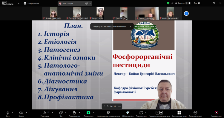 16 лютого 2026 року доцент кафедри фізіології хребетних і фармакології Григорій БОЙКО провів відкриту лекцію з дисципліни «Ветеринарна токсикологія» для студентів 4 курсу на тему: «Токсикологія фосфорорганічних сполук».
