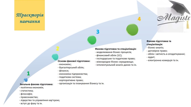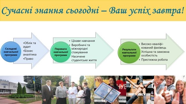 Наші випускники – це високопрофесійні та конкурентоспроможні фахівці, успішні та заможні особистості, гідні громадяни і патріоти України!!! Вони успішно реалізують себе в бізнес-середовищі в Україні та за кордоном, працюють як незалежні спеціалісти і надають послуги з обліку і бізнес-аналітики, аудиту та оподаткування, судово-економічної експертизи на рівні підприємства та в державних установах, органах влади і управління, податкових адміністраціях, контрольно-ревізійних управліннях, казначействах.