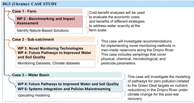 (2) water monitoring tools and soil assessments under climate change in the post-war recovery at the sub-catchment scale (Dnipro River Basin) focusing on identifying indicators of water and soil pollutants, agricultural influences, and needs of agricultural users (Fig. 1); this case contributes to WP 3 (climate and water monitoring datasets), WP 4 (optimize soil and water management);
