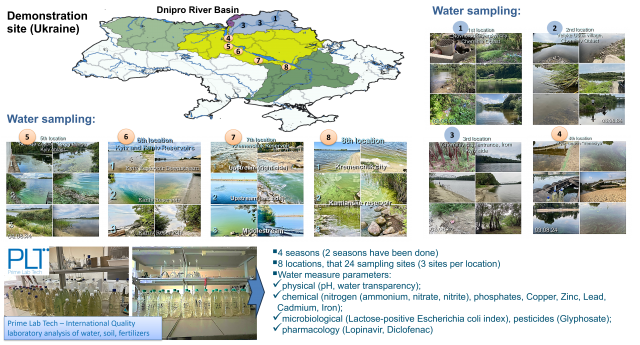The Ukrainian demonstration site covers water sampling over four seasons and includes eight water locations covering the Dnipro River Basin (Desna Subbasin and Middle Dnipro Subbasin in the Dnipro River, Fig. 2). Each location includes three sampling sites, for a total of 24 sampling sites each season. We measure water quality for 17 parameters such as nutrients, chemical pollution, and pesticides. According to this, the Ukrainian team took the samplings on 2-4 August and 18-20 October 2024.
