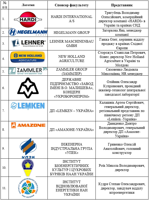 Спонсори факультету Механіко-технологічний факультет висловлює щиру подяку спонсорам за послідовне сприяння у покращенні якості підготовки сучасних агроінженерів та інженерів-транспортників!