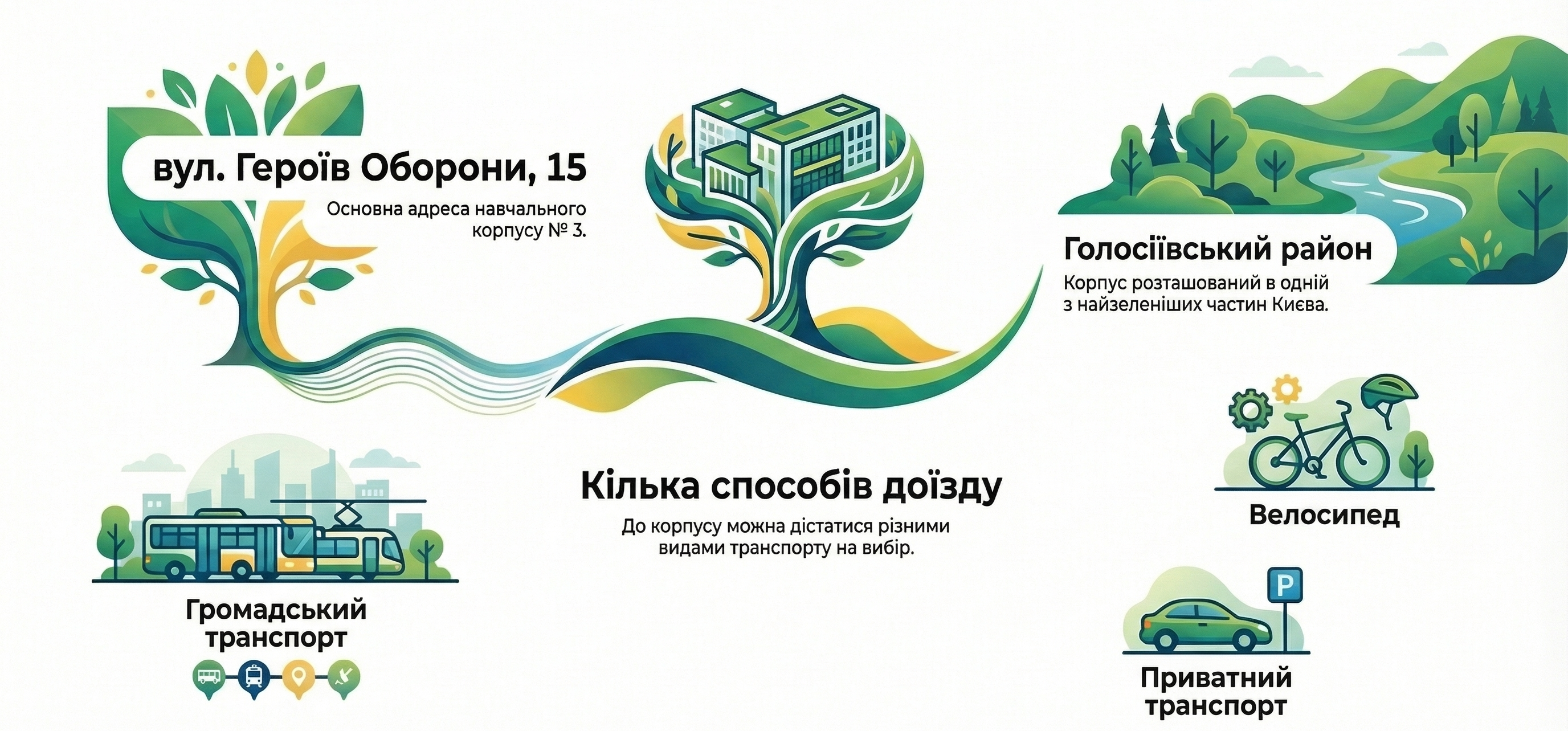 2. На автомобілі: Ви можете ввести адресу «вулиця Героїв Оборони, 15» у свій навігатор. Врахуйте, що паркування біля корпусів може бути обмежене.