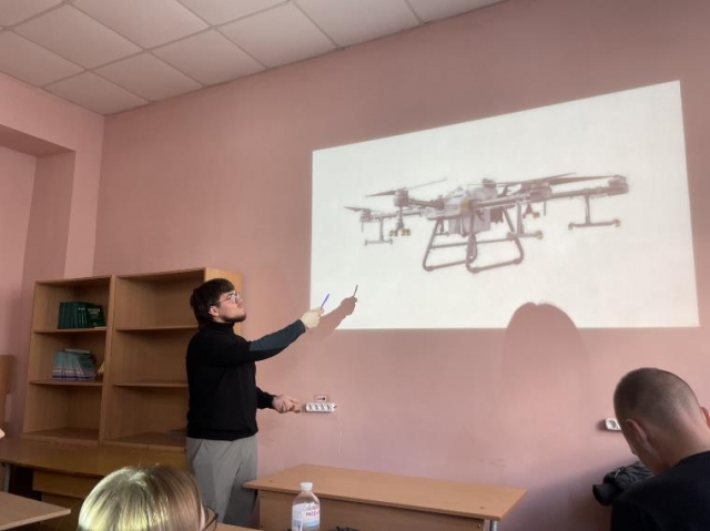 Розглянули питання доцільності та ефективності роботи дрона, його конструкцію, технологічний процес внесення ЗЗР, елементи управління, моніторинг якості виконання робіт