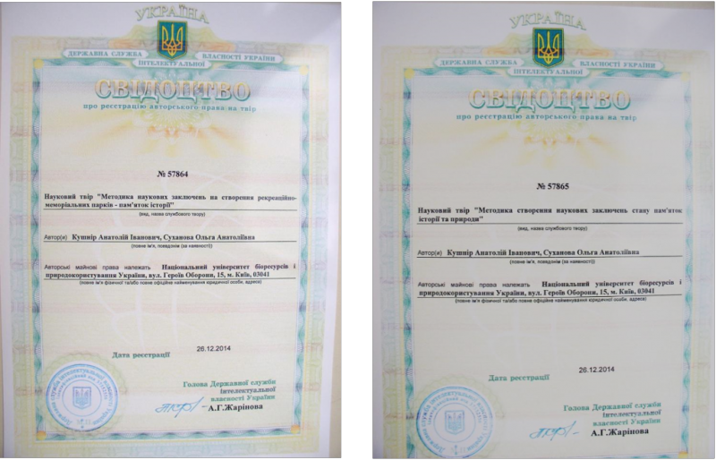 Методика наукових заключень на створення рекреаційно- меморіальних парків-пам’яток історії (Свідоцтво про реєстрацію авторських прав на твір № 57865).