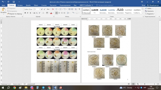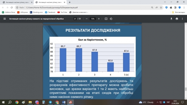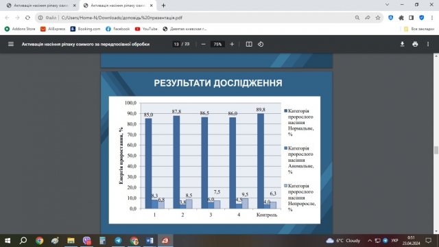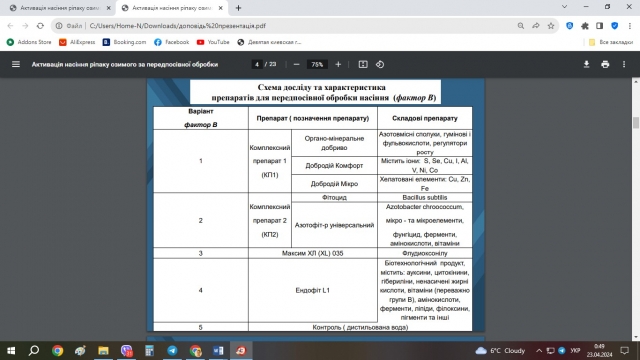 Результати проведених досліджень дозволили зробити висновки щодо ефективності препаратів з різним механізмом дії для передпосівної обробки насіння та їх вплив на стимуляцію розвитку насіння.