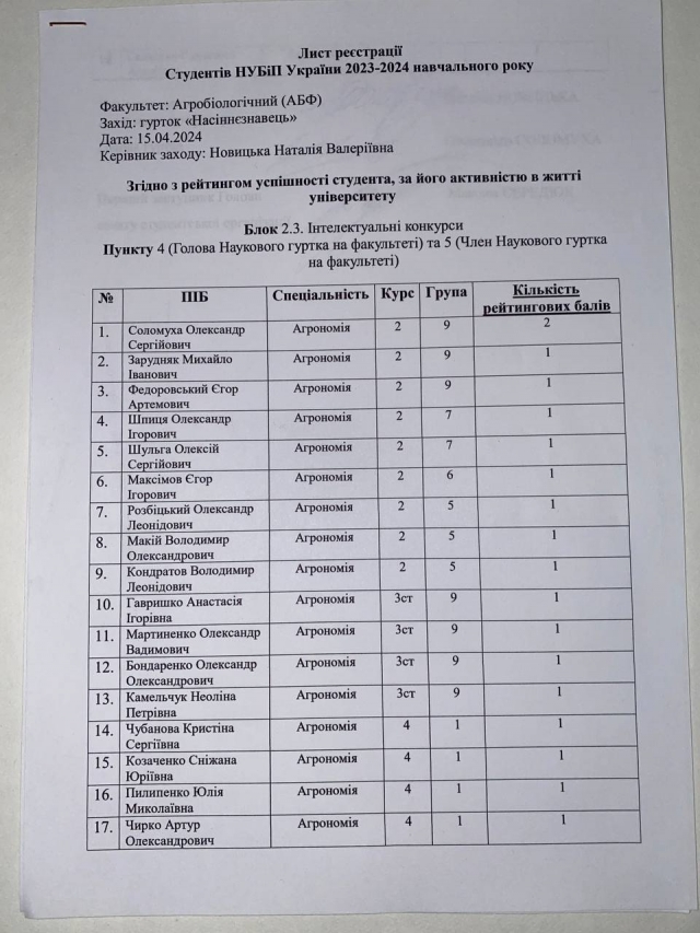 Найактивніший член гуртка «Насіннєзнавець» СОЛОМУХА Олександр Сергійович, студент 2 курс 9 група АБФ прийняв участь у І етап конкурсу студентських наукових робіт, що відбувався 12 квітня 2024 року на агробіологічному факультеті у відповідності до наказу ректора Національного університету біоресурсів і природокористування України (№ 144 від 23.02.2024 р.).