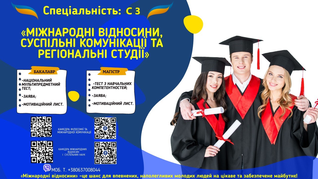 Кафедра філософії та міжнародної комунікації та кафедра міжнародних відносин та суспільних наук щиро запрошують на навчання за спеціальністю С3 «Міжнародні відносини, суспільні комунікації та регіональні студії» майбутніх фахівців у сфері міжнародних відносин, суспільних комунікацій та соціальної взаємодії.