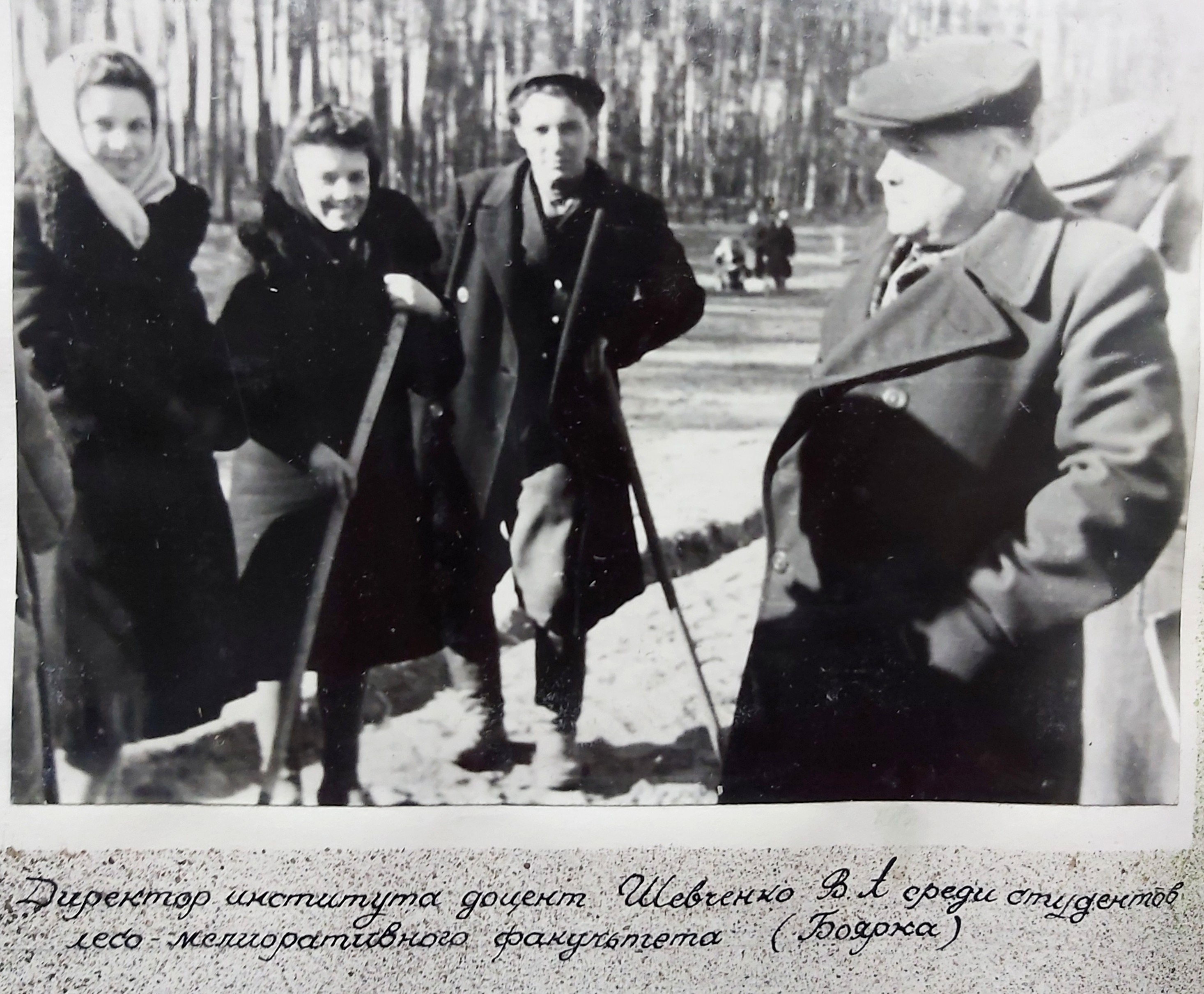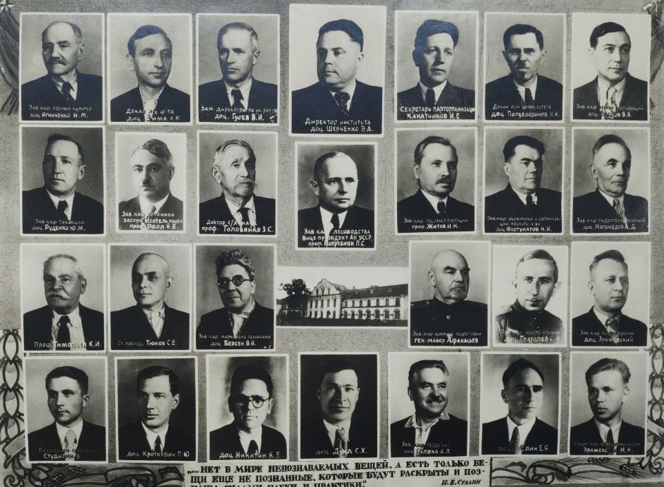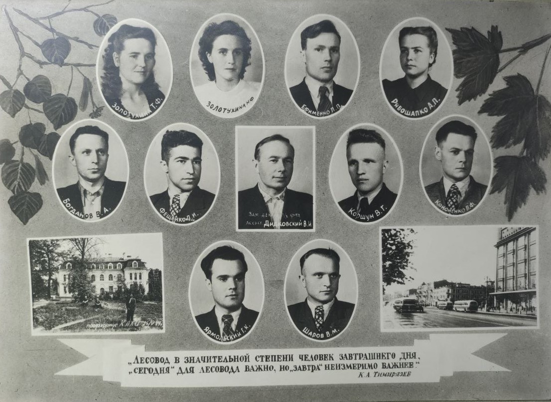 (мова оригіналу: зав. каф. лесных культур доц. Ягниченко Н.М., декан л.х. ф-та доц. Зима И.М., зам. директора по уч. работе доц. Гусев В.И., директор института доц. Шевченко В.А., секретарь парторганизации Канатчиков И.Е., декан л/м факультета доц. Полубояринов И.И., зав. каф. лесных мелиораций доц. Бодров В.А., зав. каф. таксации доц. Руденко Ю.М., зав. каф. ботаники заслуж. деятель науки проф. Ролл Я.В., доктор с/х наук проф. Головянко З.С., зав. каф. лесоводства вице-президент АН УССР проф. Погребняк П.С., зав. каф. лесоэксплоатации проф. Житов И.Н., зав. каф. экономики и организации лесного х-ва доц. Фортунатов Н.И., зав. каф. гидротехмелиораций доц. Магомедов А.Д., проф. Тимофеев К.И., ст. препод. Тюков С.Е., зав. каф. марксизма-ленинизма доц. Берсен В.Я., зав. каф. военной подготовки ген-майор Афанасьев, зав. каф. иностранных языков доц. Глаголев С.А., зав. каф. почвоведения доц. Зражевский, председатель профкома Студилин В., доц. Кроткевич П.Ю., доц. Никитин К.Е., доц. Дука С.Х., зав. каф. геодезии доц. Солоха А.Л., доц. Елин Е.Я., секретарь Ком. организации Зражевский М.Н.)
