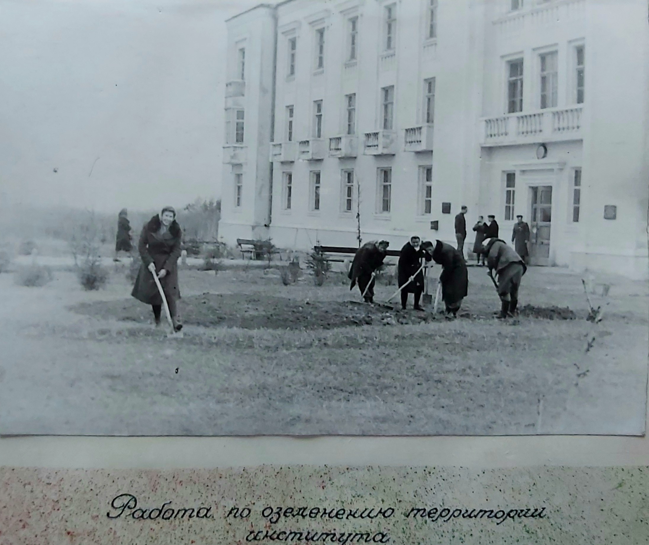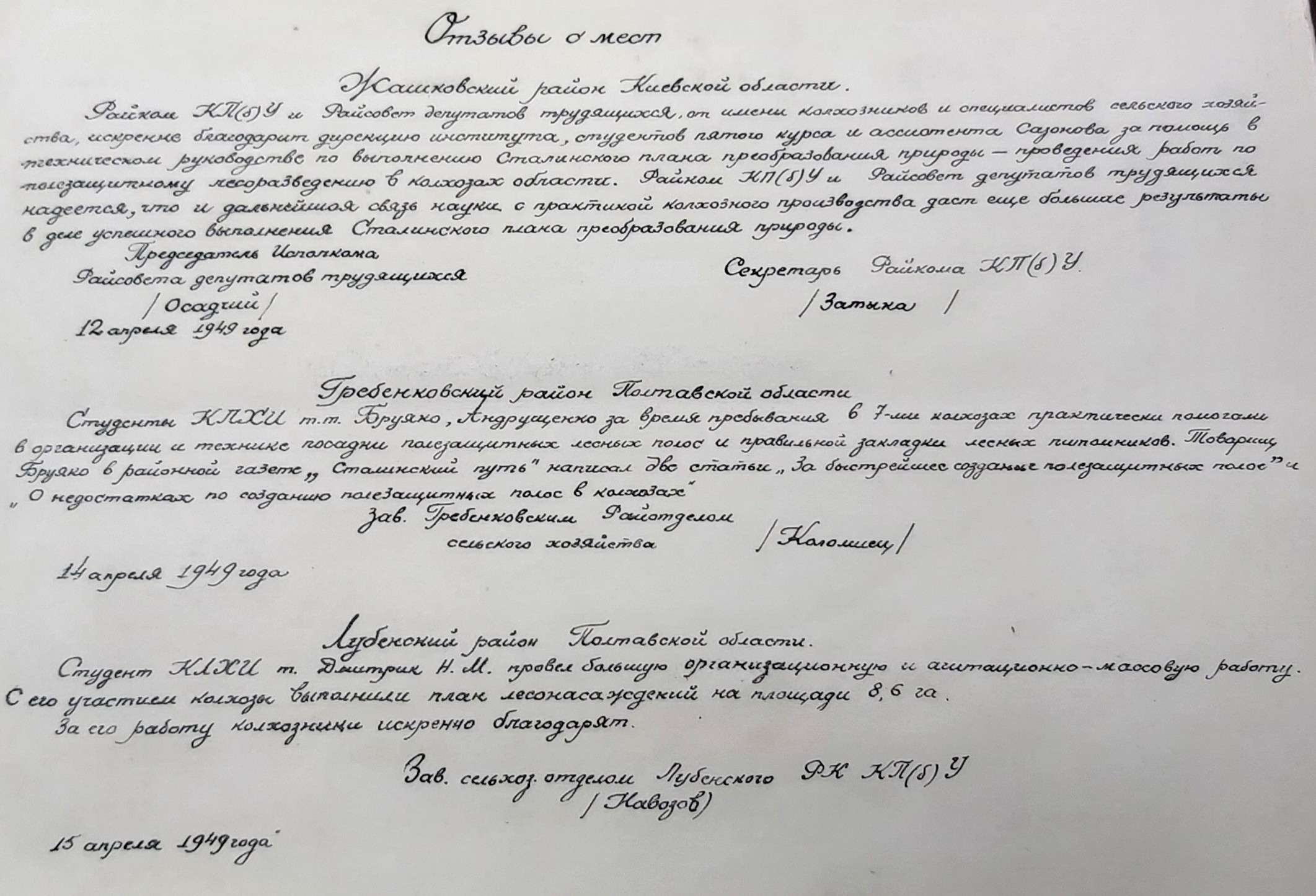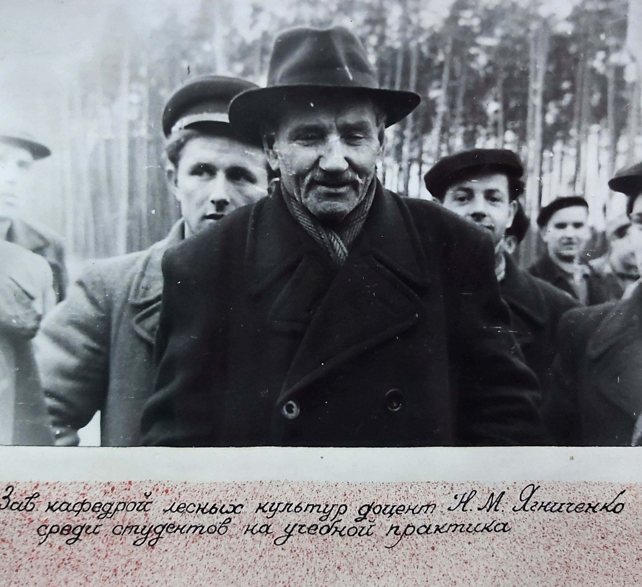 (мова оригіналу: зав. каф. лесных культур доц. Ягниченко Н.М., декан л.х. ф-та доц. Зима И.М., зам. директора по уч. работе доц. Гусев В.И., директор института доц. Шевченко В.А., секретарь парторганизации Канатчиков И.Е., декан л/м факультета доц. Полубояринов И.И., зав. каф. лесных мелиораций доц. Бодров В.А., зав. каф. таксации доц. Руденко Ю.М., зав. каф. ботаники заслуж. деятель науки проф. Ролл Я.В., доктор с/х наук проф. Головянко З.С., зав. каф. лесоводства вице-президент АН УССР проф. Погребняк П.С., зав. каф. лесоэксплоатации проф. Житов И.Н., зав. каф. экономики и организации лесного х-ва доц. Фортунатов Н.И., зав. каф. гидротехмелиораций доц. Магомедов А.Д., проф. Тимофеев К.И., ст. препод. Тюков С.Е., зав. каф. марксизма-ленинизма доц. Берсен В.Я., зав. каф. военной подготовки ген-майор Афанасьев, зав. каф. иностранных языков доц. Глаголев С.А., зав. каф. почвоведения доц. Зражевский, председатель профкома Студилин В., доц. Кроткевич П.Ю., доц. Никитин К.Е., доц. Дука С.Х., зав. каф. геодезии доц. Солоха А.Л., доц. Елин Е.Я., секретарь Ком. организации Зражевский М.Н.)