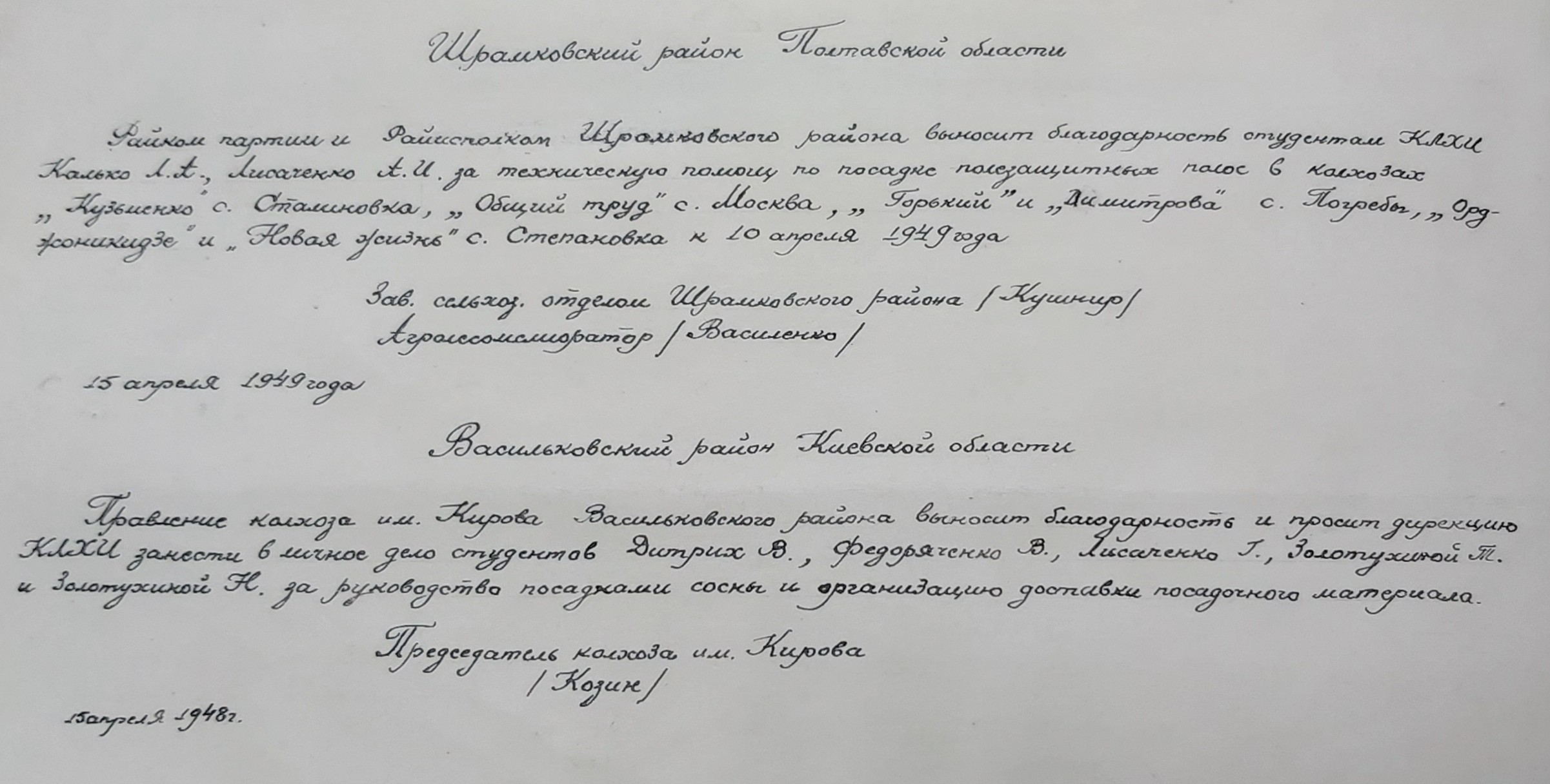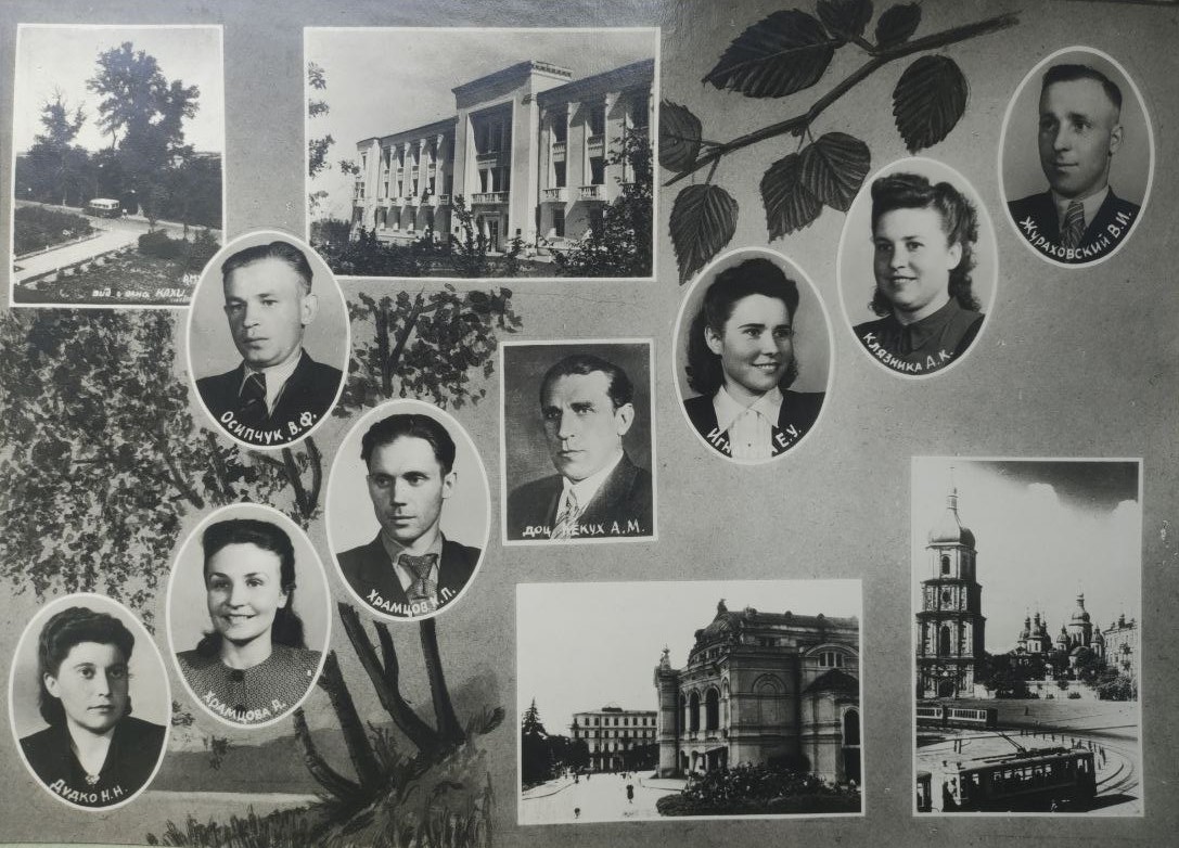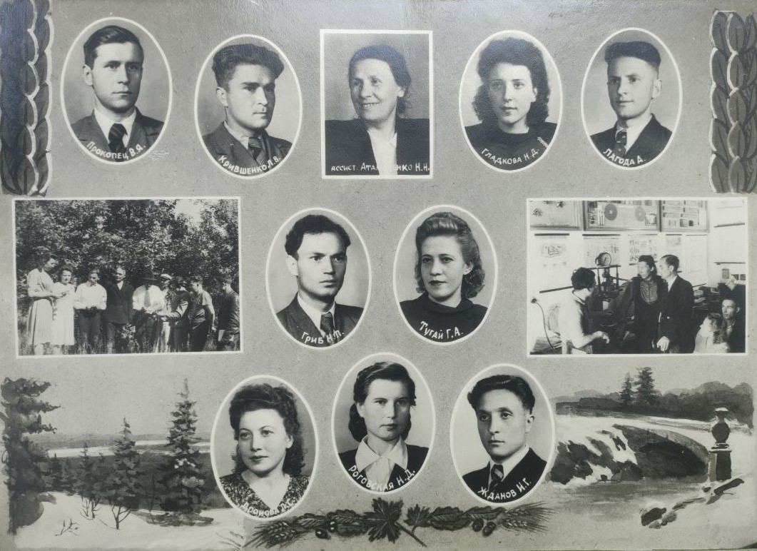 (мова оригіналу: Гавловский Н.А., Дыченко П.Г., Чобитько Н., Чобитько Г.Л., Харченко Д.И., Коган В.А., Лукьянова Г.Н., Франко Н.З., Харченко Н.И., Стоколяс И.Н., ассист. Сазонов И.Н., Майборода М.М., Дрыжук О.П., Золотухина Т.Ф., Золотухина Н.Ф., Ефименко П.П., Рябошапко А.П., Богданов В.А., Фещенко П.И., зам. декана л/х ф-та ассист. Дидковский В.И., Коршун В.Г., Кононенко В.Ф., Ярмольский Г.К., Шаров В.М.)