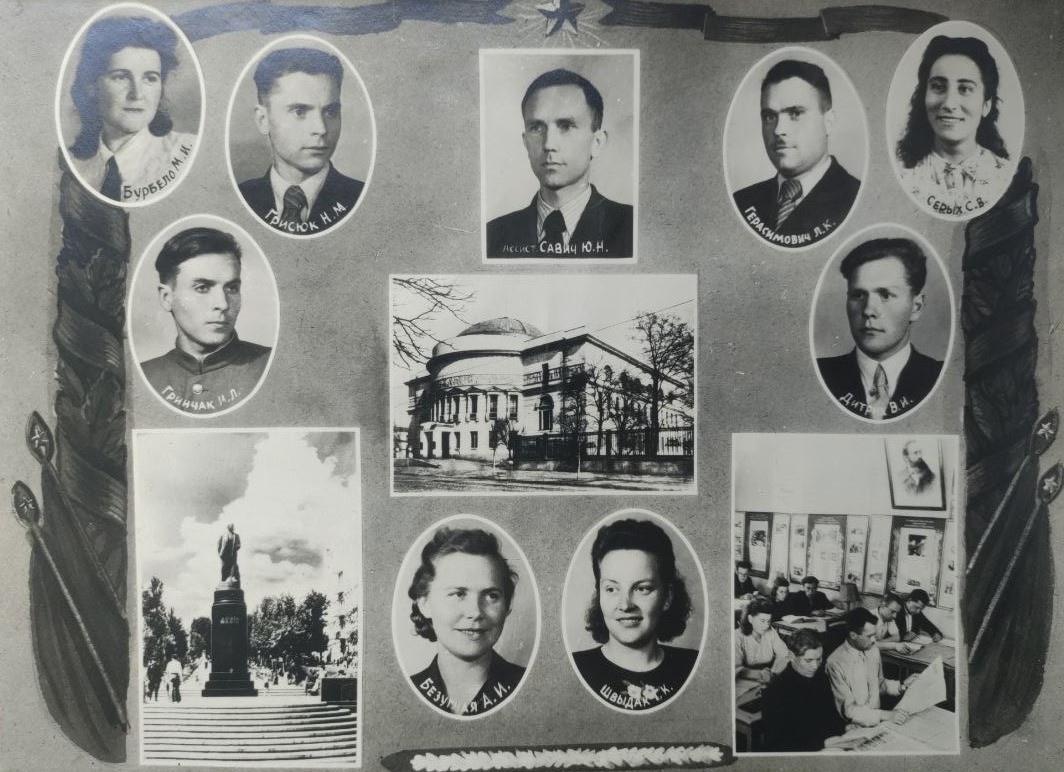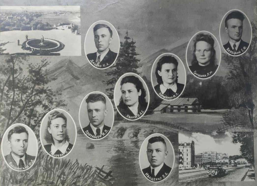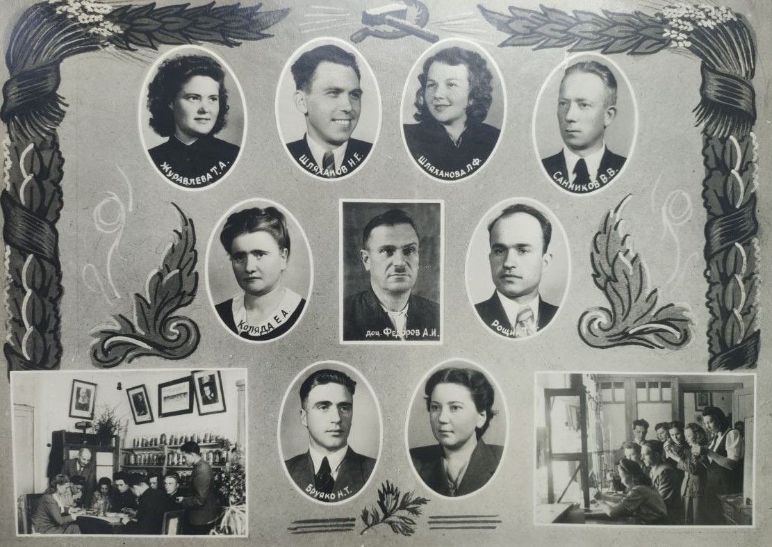 (мова оригіналу: Журавлева Т.А., Шляханов Н.Е., Шляханова Л.Ф., Санников В.В., Коляда Е.А., доц. Федоров А.И., Рощик Т.К., Бруяко Н.Т., ?, Бурбело М.И., Грисюк Н.М., ассист. Савич Ю.Н., Герасимович Л.К., Серых С.В., Гринчак Н.Л., Дитрих В.И., Безуглая А.И., Швыдак Г.К.)