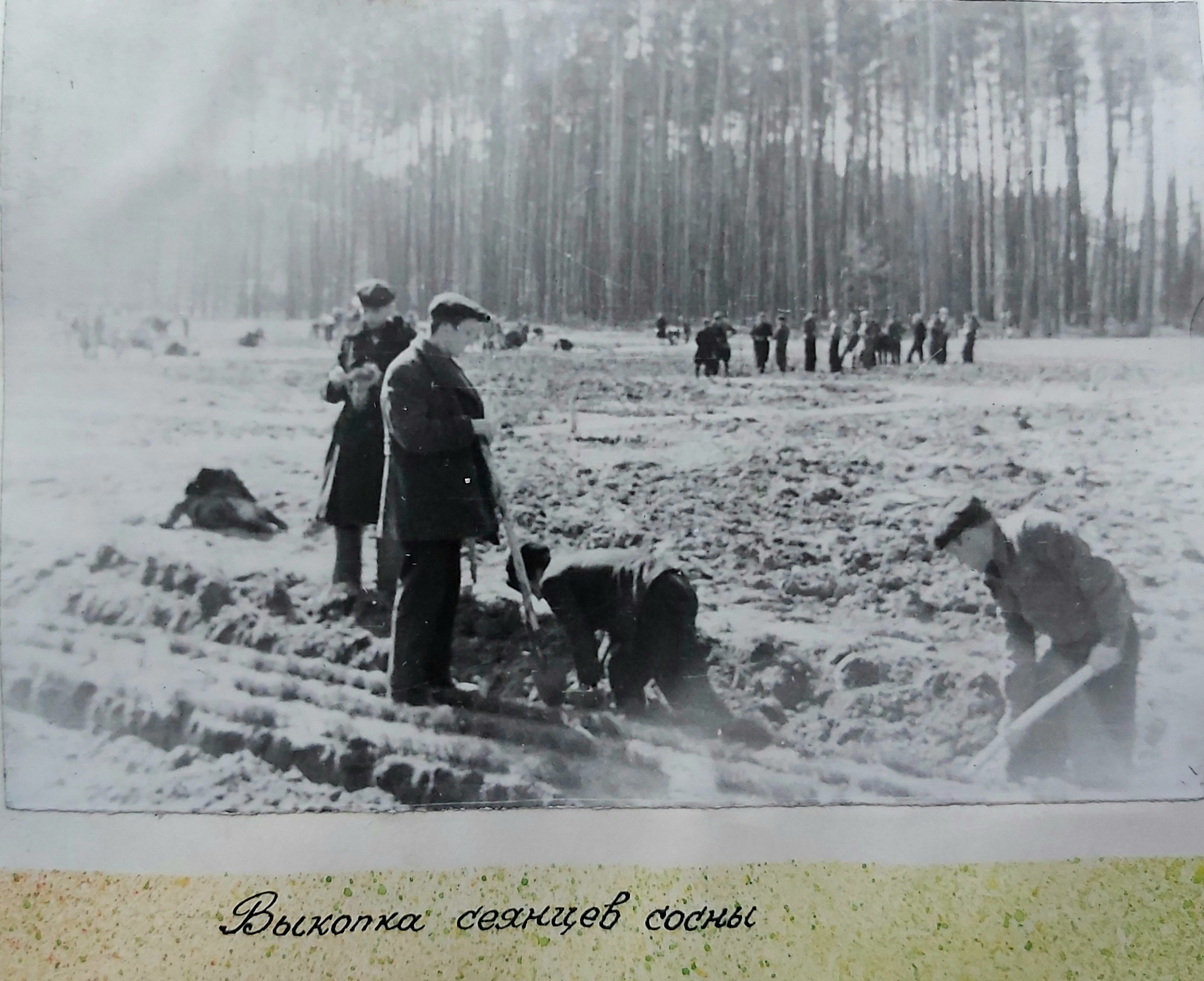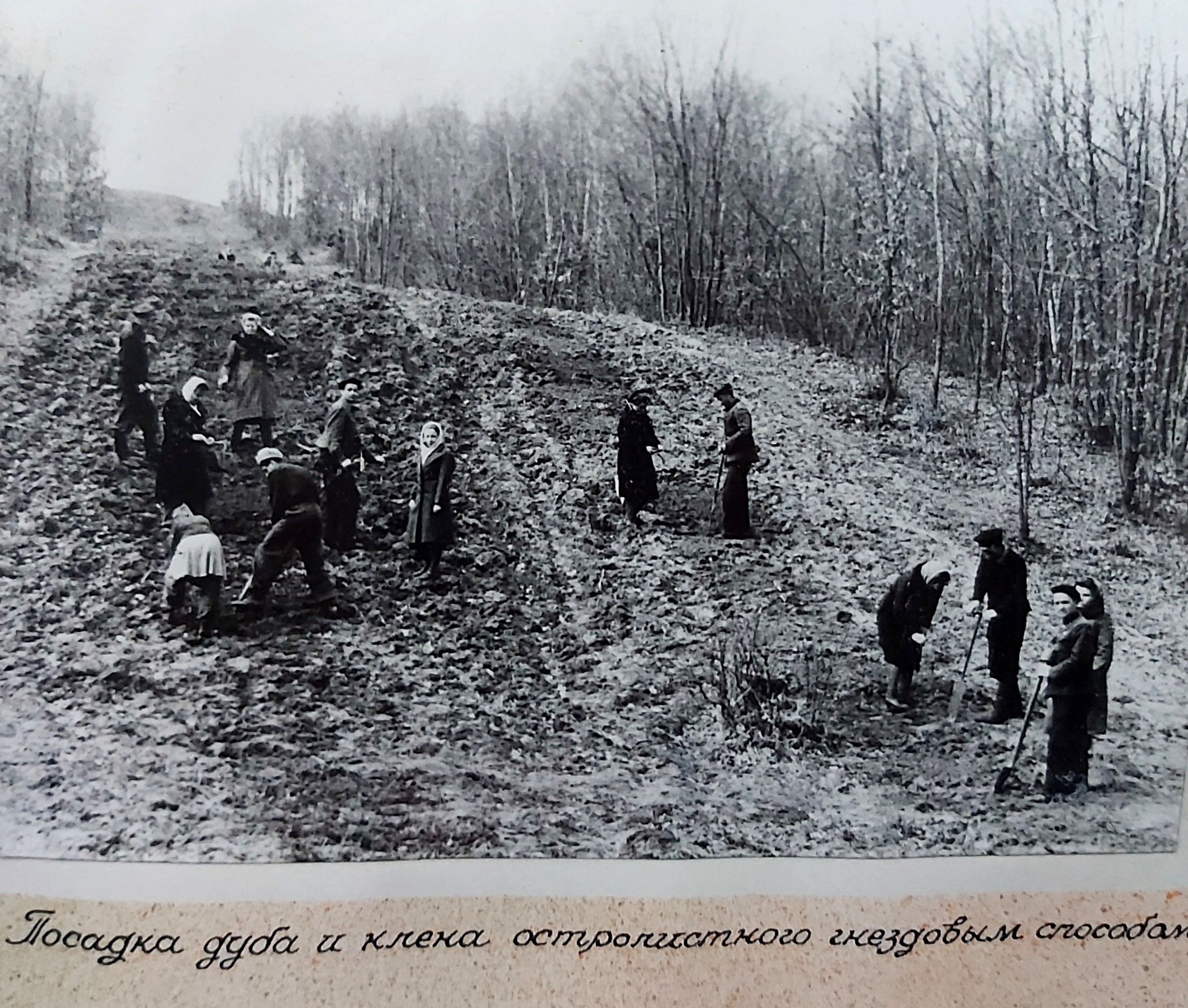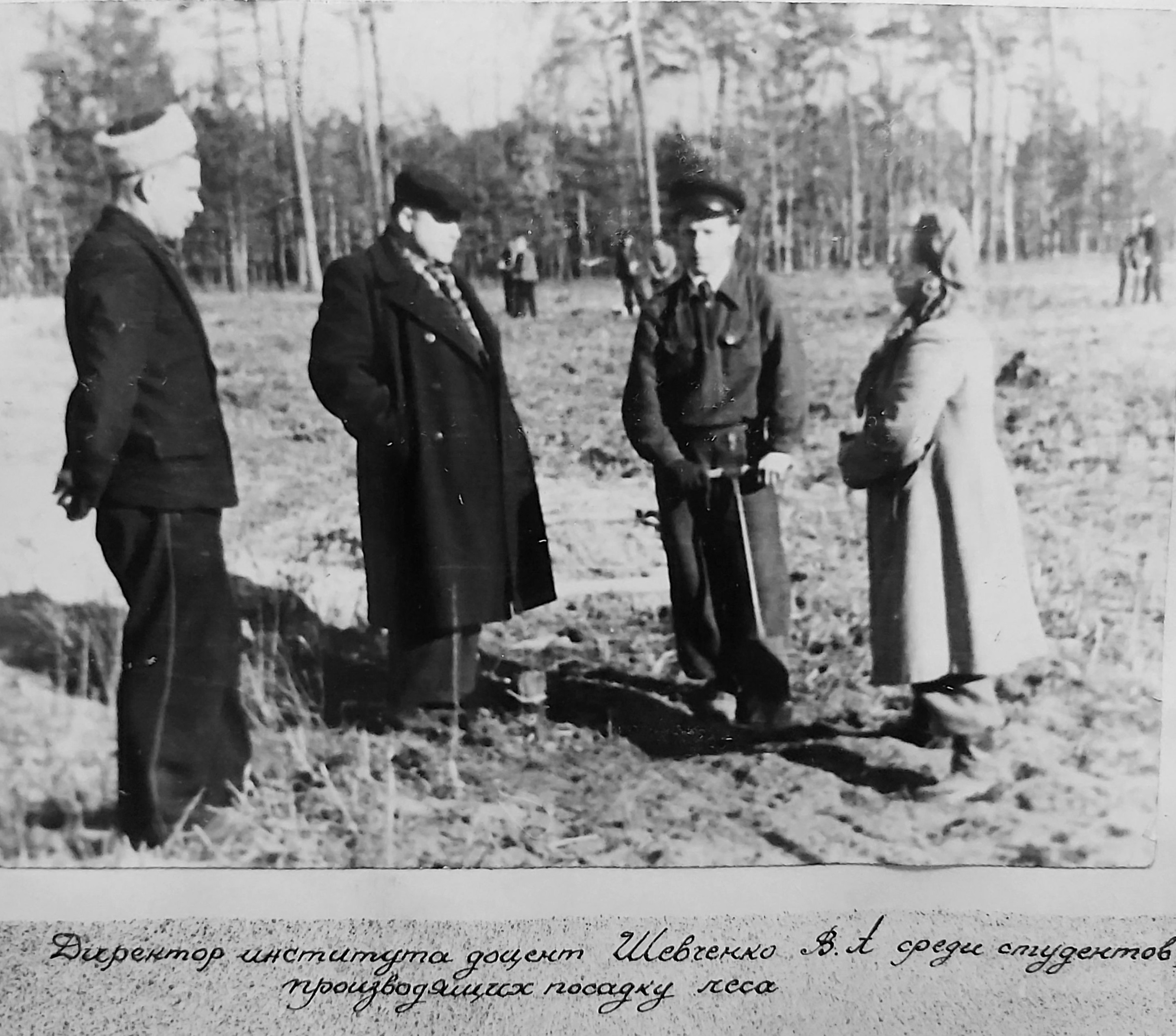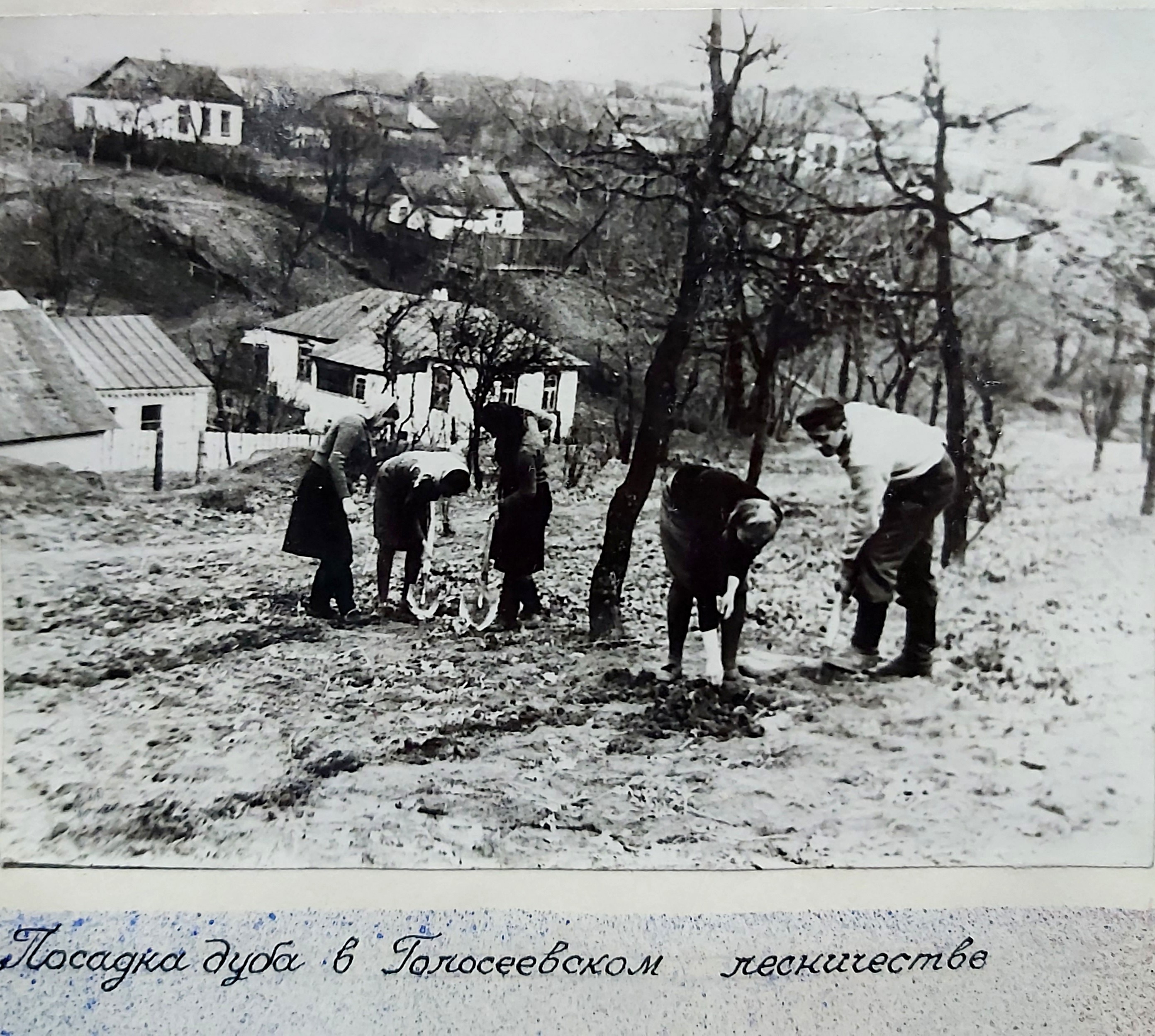 1949 рік. Лісовідновлювальні роботи студентів Київського лісогосподарського інституту у Боярському навчально-дослідному лісгоспі.