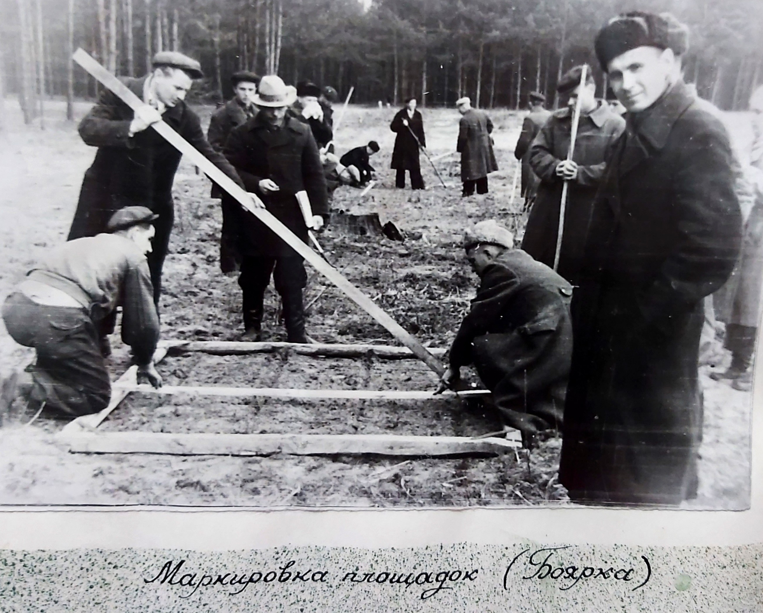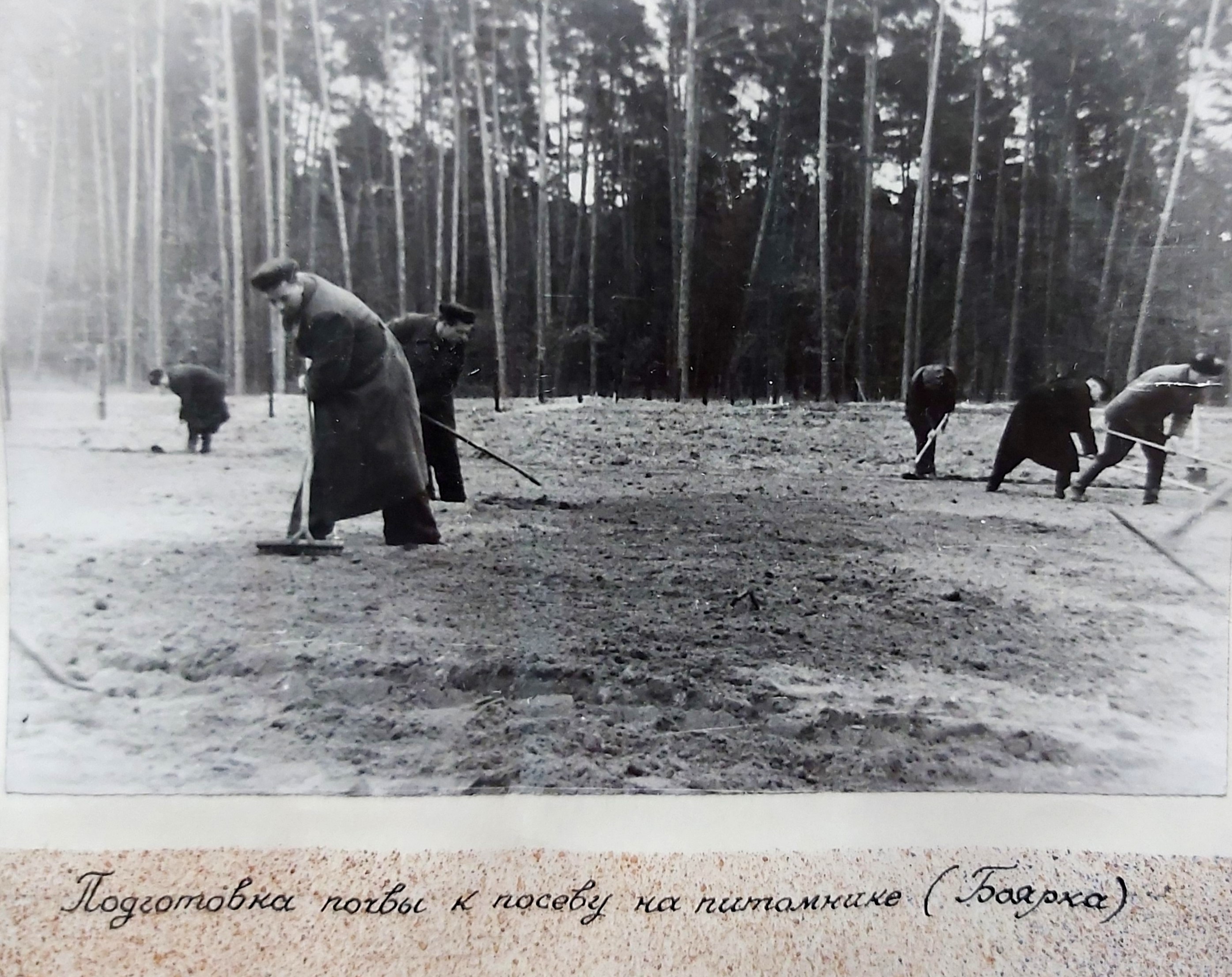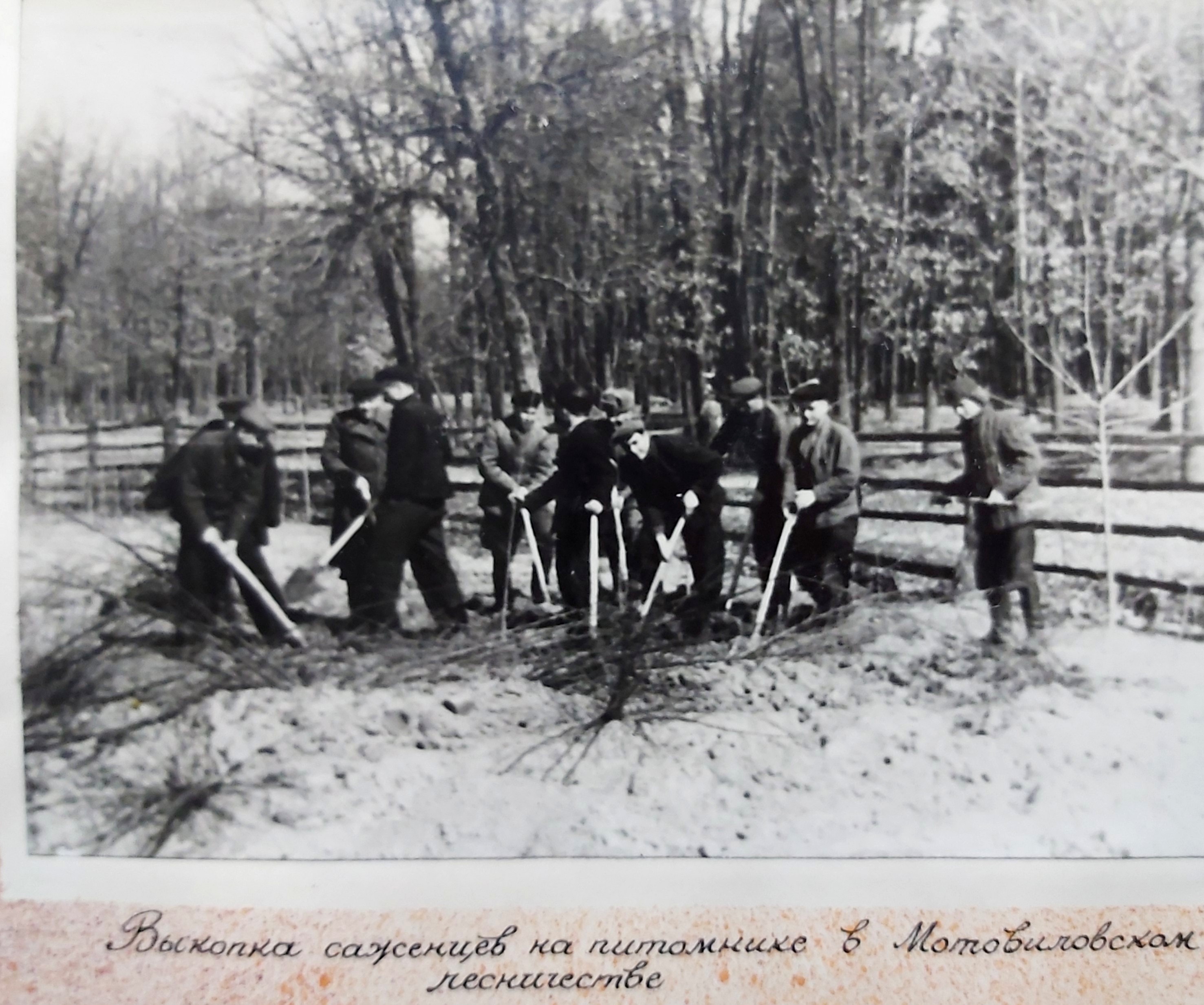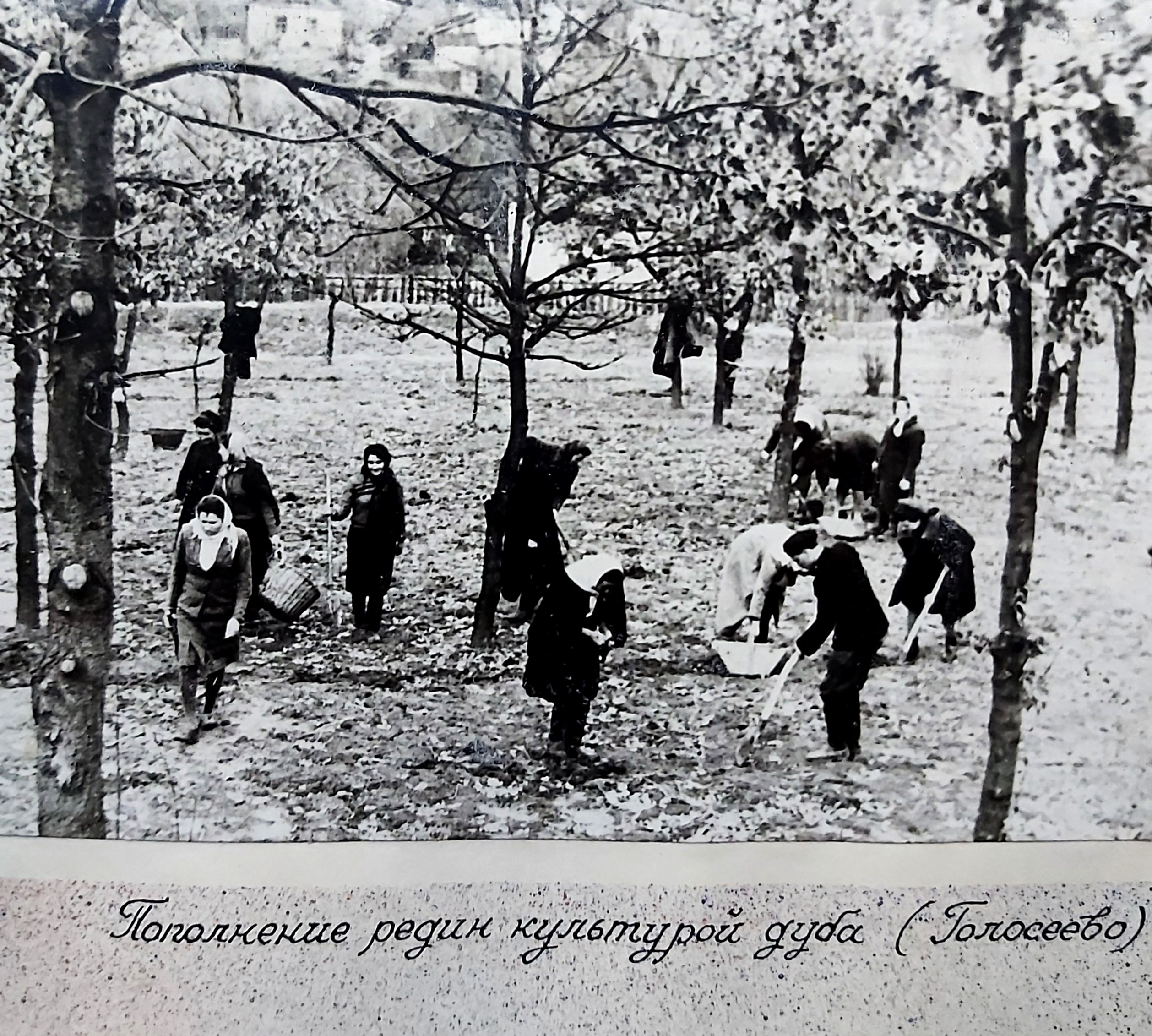 1949 рік. Лісовідновлювальні роботи студентів Київського лісогосподарського інституту у Боярському навчально-дослідному лісгоспі.