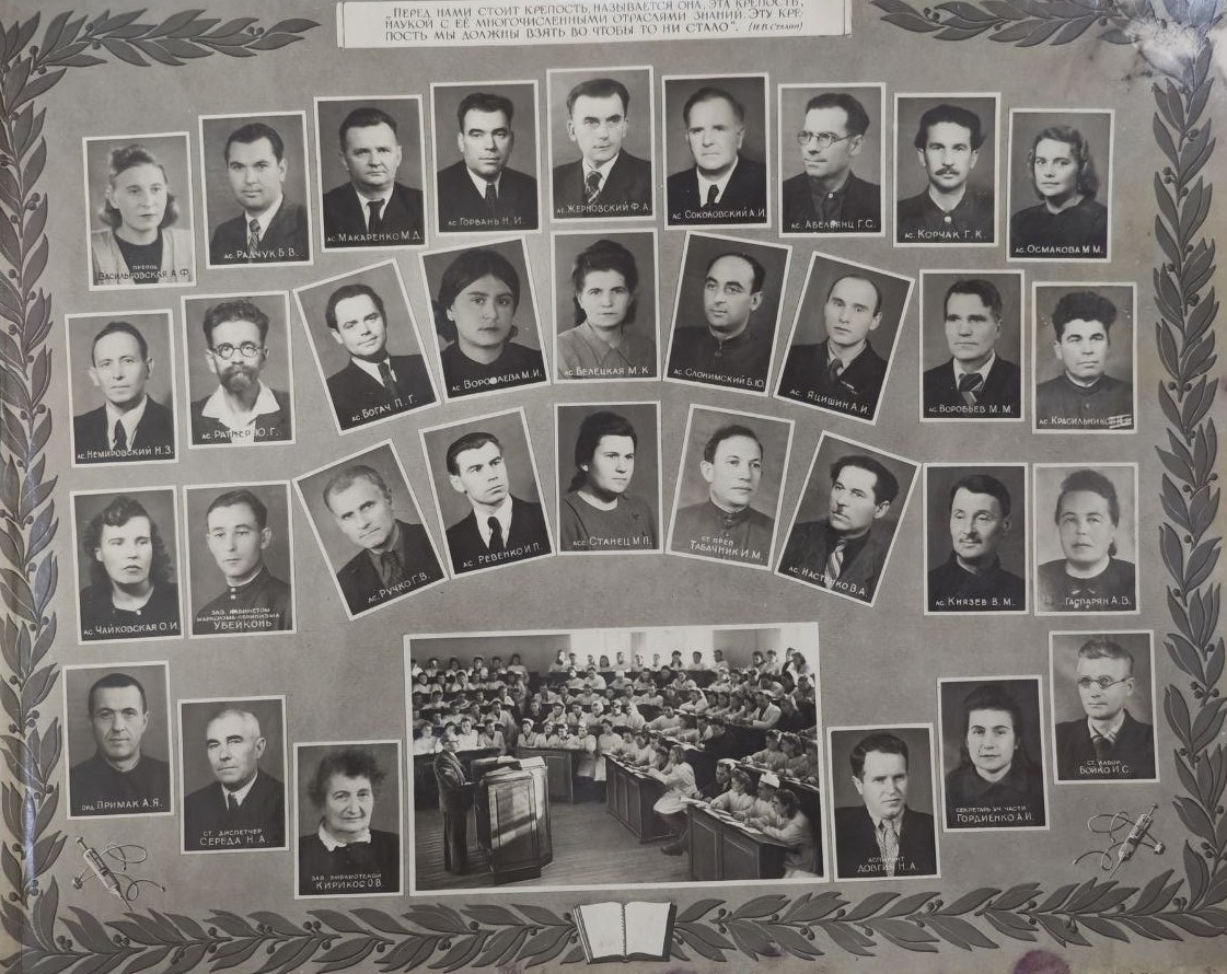 Викл. Васильковська А.Ф., ас. Радчук Б.В., ас. Макаренко М.Д., ас. Горбань Н.І., ас. Жерновський Ф.А., ас. Соколовський А.І., ас. Абельянц Г.С., ас. Корчак Г.К., ас. Осмакова М.М., ас. Немировський Н.З., ас. Ратнер Ю.Г., ас. Богач П.Г., ас. Воропаєва М.І., ас. Білецька М.К., ас. Слонимський Б.Ю., ас. Яцишин А.І., ас. Воробйов М.М., ас. Красильников І.Н., ас. Чайковська О.І., зав. кабінетом марксизму-ленінізму Убейконь, ас. Ручко Г.В., ас. Ревенко І.П., ас. Станець М.П., ст. викл. Табачник І.М., ас. Настенко В.А., ас. Князєв В.М., Гаспарян А.В., орд. Примак А.Я., ст. диспетчер Середа Н.А., зав. бібліотекою Кирикос О.В., аспірант Довгич Н.А., секретар навч. частини Гордієнко А.І., ст. лаборант Бойко І.С.