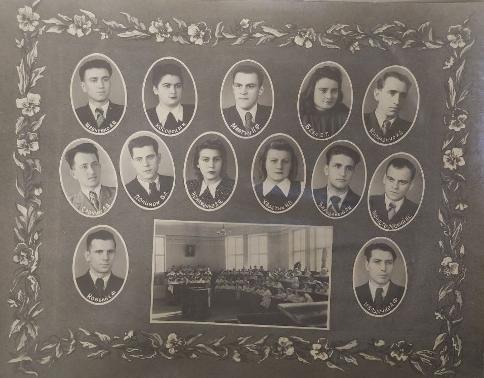 (мова оригіналу: Карпизин Н.М., Рябоконь Н.П., Предко И.Г., проф. Гирко П.А., проф., д-р наук Демиденко Т.Т., декан ф-та, доц. Калюжный В.Е., директор Долгополов Т.С., доц. Пшеничный Н.Е., предс. госуд. комисс. Ларионов Д.К., проф. Михайловский А.Г., Миневский В.Я., Киселева Т.Н., Костенко В.Т., Киреев Ф.Н., Назарок М.И., Марченко А.Н., Потапенко И.Ф., Алексеева Е.С., доц. Маслов А.И., доц. Сироцинский К.Е., доц. Сакало В.Д., доц. Манойленко Е.Ф., доц. Геллер Ю.Б., Мудрик Б.А., Судак А.Е., Мудрик В.А., Полищук А.А., Сигал Л.А., Загинайко А.А., Шурша Н.И., Гребенюк Г.Ф., Снежко М.М., Самойленко И.Н., Нудьга З.А., комсорг Лапанова В., секр. партбюро Бенедикт Н.Н., профорг Хоменко И.В., Губарь М.И., Вахович Н.Е., Клятенко А.Г., Богинич В.И., Пожар А.А., Кононенко А.Д., Зозуля Г.М., Кулик А.С., Рачковский А.И., Брызицкая В.П., Балан А.Г., Крысюк Л.Н., Кирилин Б.С., Бойко А.И., Мончук А.А., Чернега Г.А., Кошелевская А.Н., Стрижаков А.М., Савицкая О.Т., Губский М.Д., Полищук А.А., Гриценко Н.М., Кратко Г.К., Полищук К.Д., Нестеренко Е.Ф., Нестеренко Л.С., Чирикалов М.О., Батюта В.И., Зелинская Е.Д., Ружицкий С.Л., Яременко В.М., Боровко И.К., Нагаевич И.Я.).