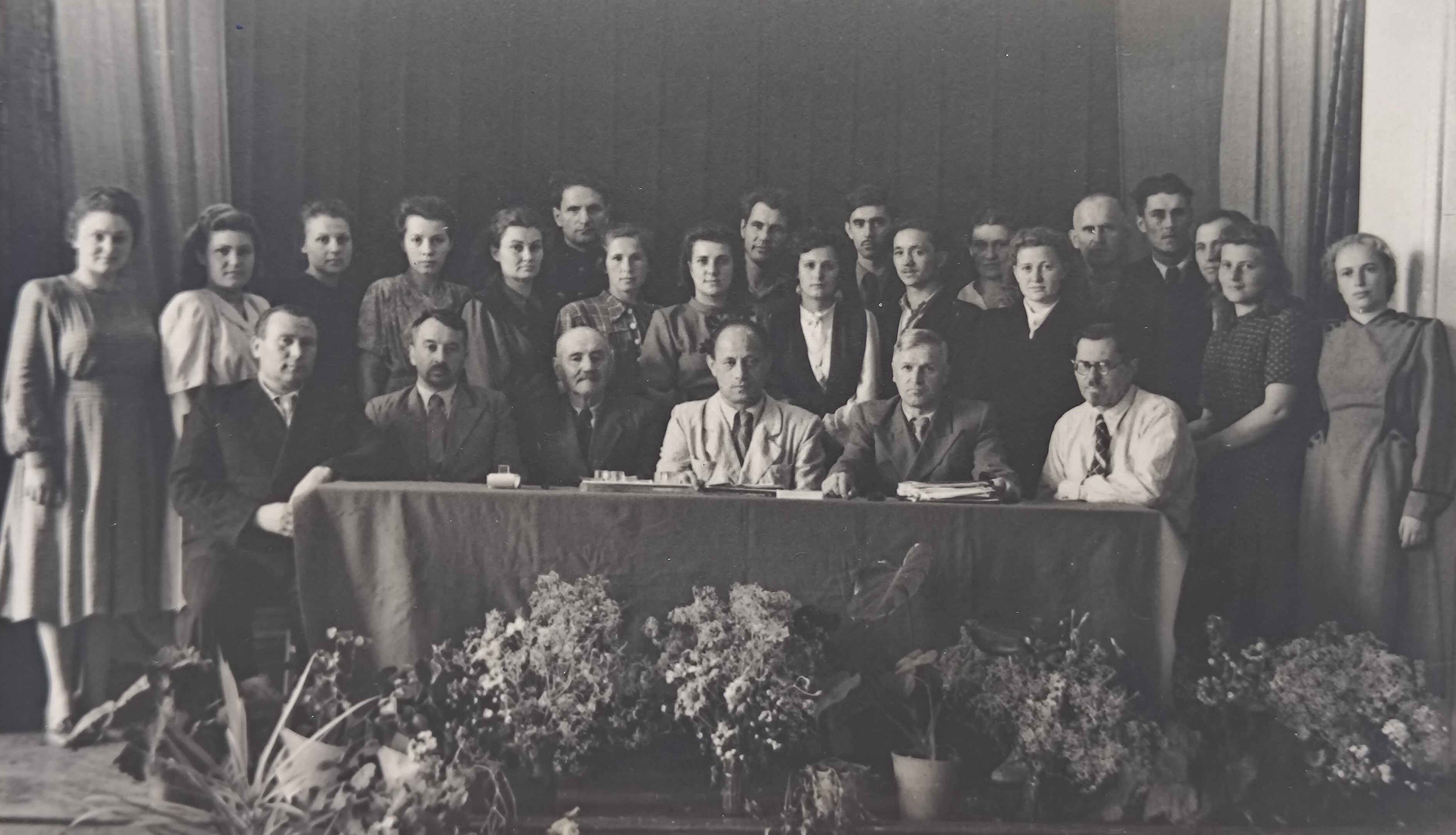 (мова оригіналу: декан л/м факультета доц. Гурмаза А.М., зам. директора Мироненко В.И., секретарь партбюро Биднык Д.Н., директор института Шитов И.Н., зам. директора доц. Гусев В.И., декан л/х фак. доцент Никитин К.Е., профессор Новиков А.Л., проф. Скобец Е.М., проф. Житов И.Н., проф. Ролл Я.В., проф. Тимофеев К.И., проф. Головянко З.С., доц. Ягниченко Н.М., проф. Поварницын В.А., доц. Солоха А.Л., доц. Дука С.Х., доц. Сикорский Ю.А., генерал-майор Шапкин, доц. Зима И.М., доц. Руденко Ю.М., ст. преподаватель Игнатенко И.М., доц. Братусь В.Н., доц. Елин Е.Я., доц. Полубояринов И.И., доц. Фортунатов Н.И., доц. Поспехов Д.А., секр. комитета комсом. Махмет Б.М., председатель профкома Герасименко П.И., доц. Глаголев С.А., доц. Адамов И.Г., зав. кафедрой Макарин М.Н.)