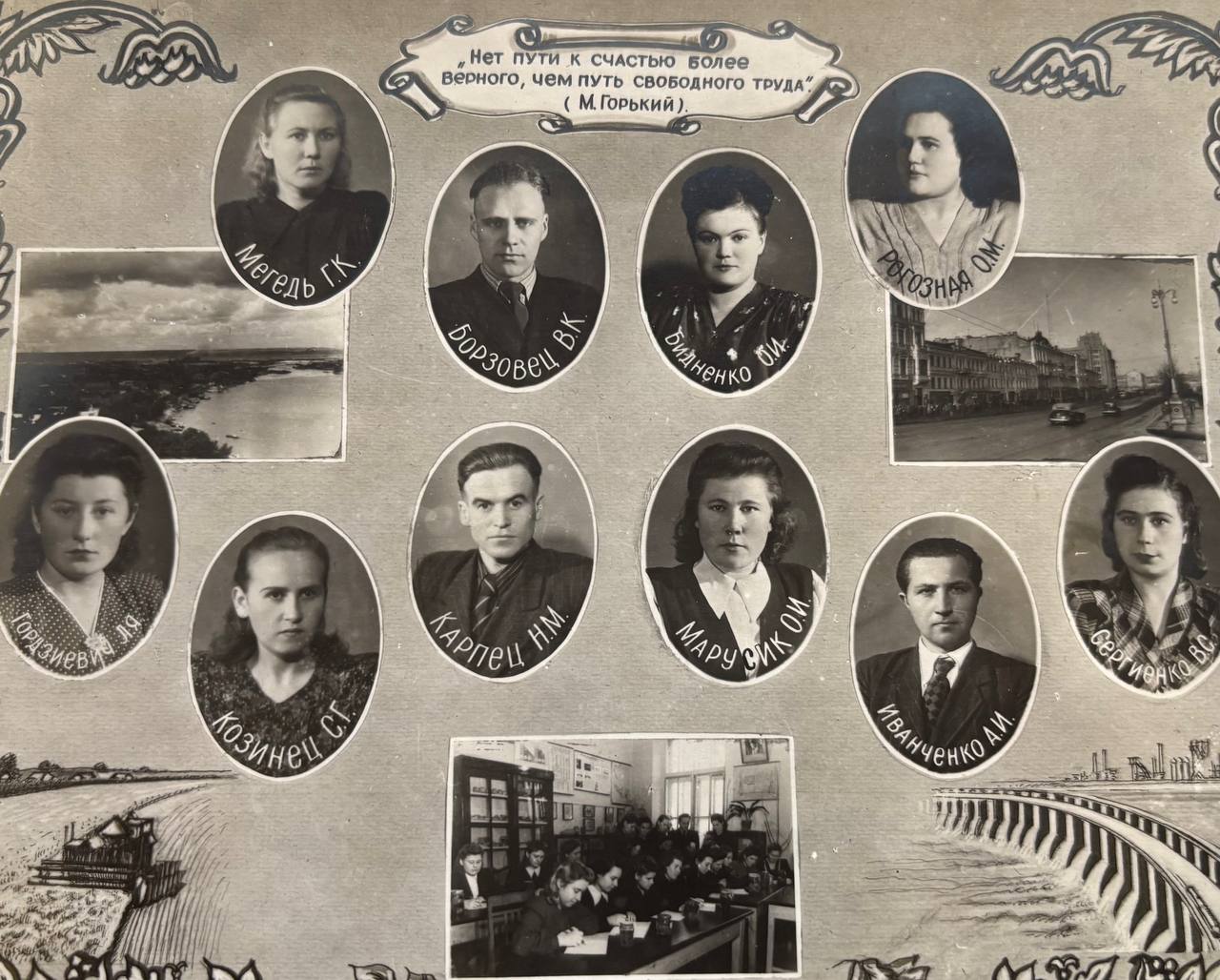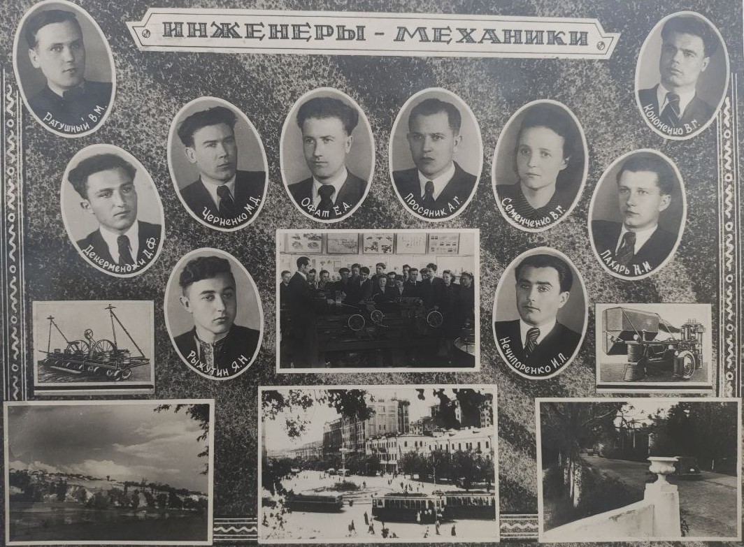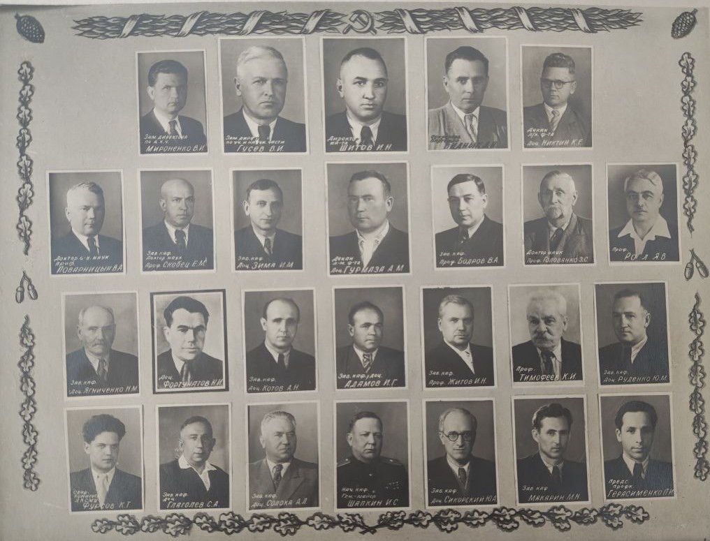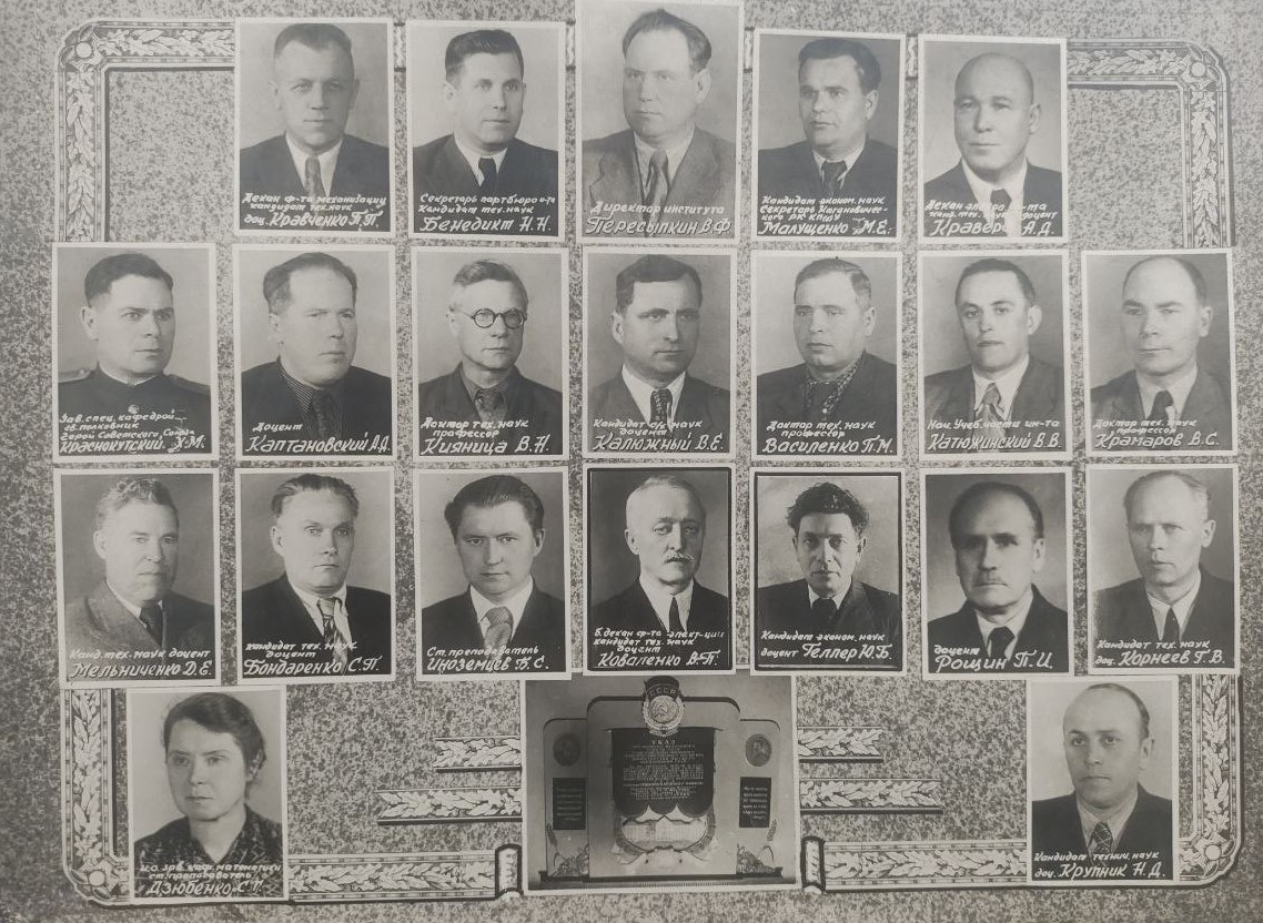 (мова оригіналу: декан ф-та механизации кандидат тех. наук доц. Кравченко П.П., секретарь партбюро и-та кандидат тех. наук Бенедикт Н.Н., директор института Пересыпкин В.Ф., кандидат эконом. наук секретарь Кагановического РК КП(б)У Малущенко М.Е., декан элекро. ф-та канд. тех. наук доцент Краверс А.Д., зав. спец. кафедрой гв. полковник Герой Советского Союза Краснокутский Х.М., доцент Каптановский А.Д., доктор тех. наук профессор Кияница В.Н., кандидат с/х наук доцент Калюжный В.Е., доктор тех. наук профессор Василенко П.М., нач. учеб. части ин-та Катюжинский В.В., доктор тех. наук профессор Крамаров В.С., канд. тех. наук доцент Мельниченко Д.Е., канд. тех. наук доцент Бондаренко С.П., ст. преподаватель Иноземцев Б.С., б. декан ф-та элект-ции канд. тех. наук доцент Коваленко В.П., канд. эконом. наук доцент Геллер Ю.Б., доцент Рощин П.И., канд. тех. наук доцент Корнеев Г.В., и.о. зав. каф. математики ст. преподаватель Дзюбенко С.Г., канд. тех. наук доцент Крупник Н.Д.)