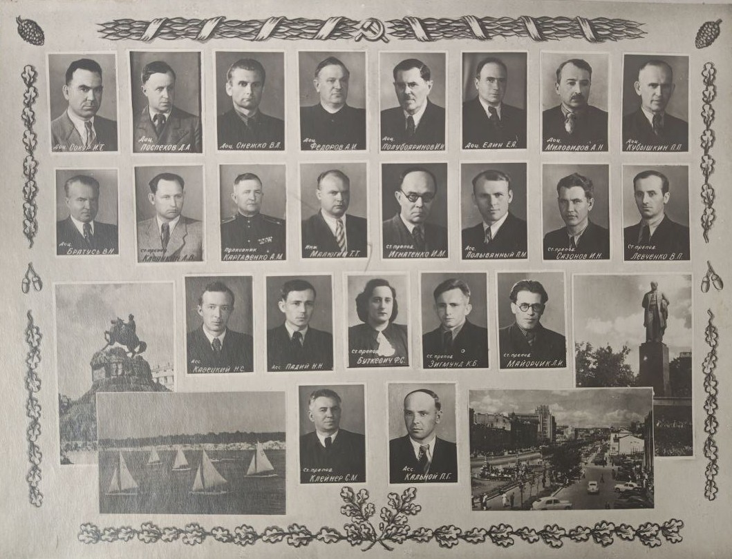 (мова оригіналу: доц. Сокур И.Т., доц. Поспехов Д.А., доц. Снежко В.Л., доц. Федоров А.И., доц. Полубояринов И.И., доц. Елин Е.Я., доц. Миловидов А.Н., доц. Кубішкин П.П., доц. Братусь В.Н., ст. препод. Клеянкин А.В., полковник Картавенко А.М., инж. Малюгин Т.Т., ст. препод. Игнатенко И.М., асс. Полывянный П.М., ст. препод. Сазонов И.Н., ст. препод. Левченко В.П., асс. Кавецкий Н.С., асс Падий Н.Н., ст. препод. Буткевич Ф.С., ст. препод. Зигмунд К.Б., ст. препод. Майорчик Л.И., ст. препод. Клейнер С.М., асс. Кальной П.Г.)