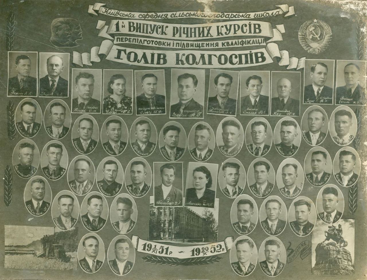 1952 рік. 1 випуск річних курсів перепідготовки і підвищення кваліфікації голів колгоспів. Київська середня сільськогосподарська школа