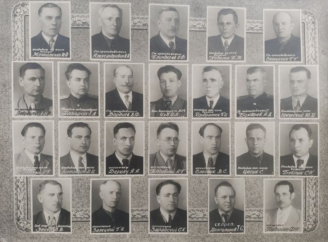 (мова оригіналу: канд. с/х наук доцент Манойленко Ю.Ф., ст. преподаватель Александрович И.А., ст. преподаватель Блиндеров В.Ф., канд. с/х наук доцент Подолич Б.М., ст. преподаватель Онищенко Г.Г., ст. преподаватель Лаврентьев М.В., гвардии подполковник Канарчук Е.А., ст. преподаватель Вардиев В.Ф., зам. директора по АХЧ Чуб И.Л., канд. тех. наук доцент Кондратюк П.И., гвардии подполковник Бокарев А.Д., канд. тех. наук Шкурский Ю.К., канд. тех. наук доцент Могильный И.П., канд. тех. наук Натанзон И.И., ассистент Деркач А.А., ассистент Поддубный А.Г., ассистент Олейник В.С., канд. тех. наук Цесин С., канд. тех. наук доцент Бублык С.П., зав. кафед. физ. воспитания Зайка В.В., ассистент Залецкий Г.И., ассистент Зарайский С.К., ст. преп. Долгополов Т.С., ассистент Гордийко Ф.П.)