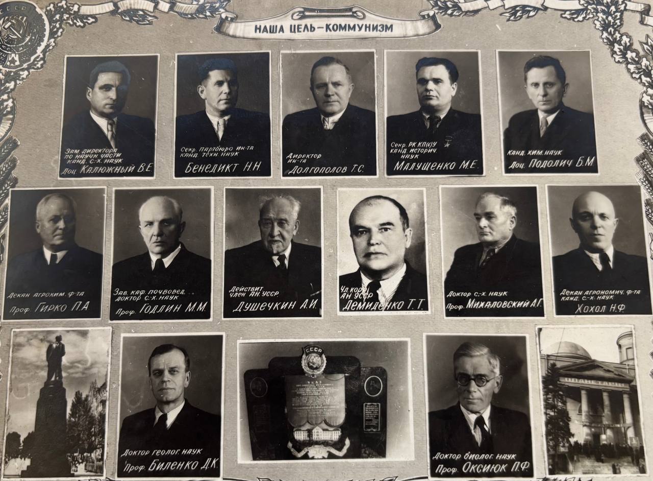 зам. директора по науч. части канд. с.-х. наук доц. Калюжный В. Е., секр. партбюро ин-та канд. техн. наук Бенедикт Н. Н., директор ин-та Долгополов Т. С., секр. РК КП(б)У канд. историч. наук Малущенко М. Е., канд. хим. наук доц. Подолич Б. М., декан агрохим. ф-та проф. Гирко П.А., зав. каф. почвовед доктор с.-х. наук проф. Годлин М. М., действит член ДН. УССР. Душечкин А. И., чл. КОРР АН УССР Демиденко Т.Т., доктор с.-х. наук проф. Михаловский А.Г., декан агрономич. ф-та канд. С.-х. наук Хохол Н.Ф., доктор геолог. наук проф. Биленко Д.К., доктор биолог. наук проф. Оксиюк П.Ф