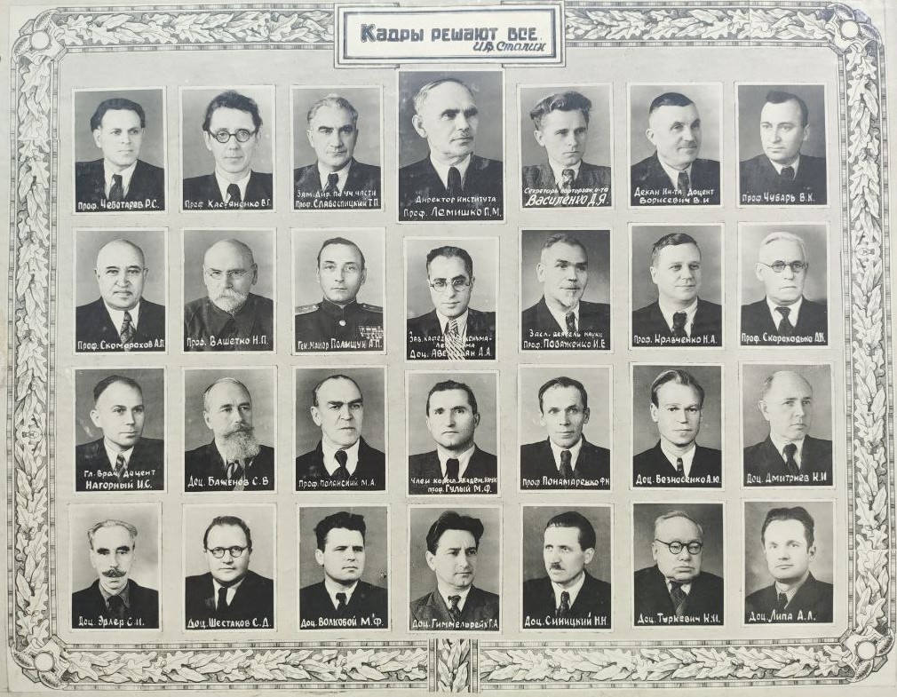 (мова оригіналу: проф. Чеботарев Р.С., проф. Кас'яненко В.Г., зам. дир. по науч. части Слабоспицкий Т.П., директор института Лемишко П.М., сектретарь парторган. и-та Василенко Д.Я., декан ин-та доц. Борисевич В.І., проф. Чубарь В.К., проф. Скоморохов А.Л., проф. Вашетко Н.П., ген. майор Полищук А.П., зав. каф. марксизма-ленинизма Аветисян А.А., засл. деятель наук проф. Поваженко И.Е., проф. Кравченко Н.А., проф. Скороходько А.К., гл. врач доц. Нагорный И.С., доц. Баженов С.В., проф. Полянский М.А., член коресп. Академии наук Гулый М.Ф., проф. Понамаренко Ф.М., доц. Безносенко А.Ю., доц. Дмитриев К.И., доц. Эрлер С.И., доц. Шестаков С.Д., доц. Волкобой М.Ф., доц. Гиммельрейх Г.А., доц. Синицкий Н.Н., доц. Туркевич К.И., доц. Липа Д.Л.)
