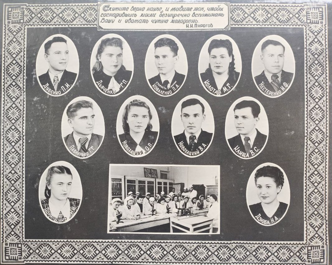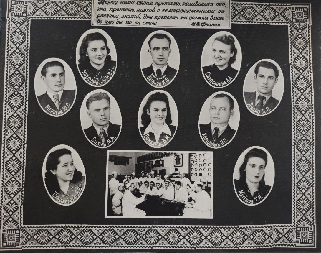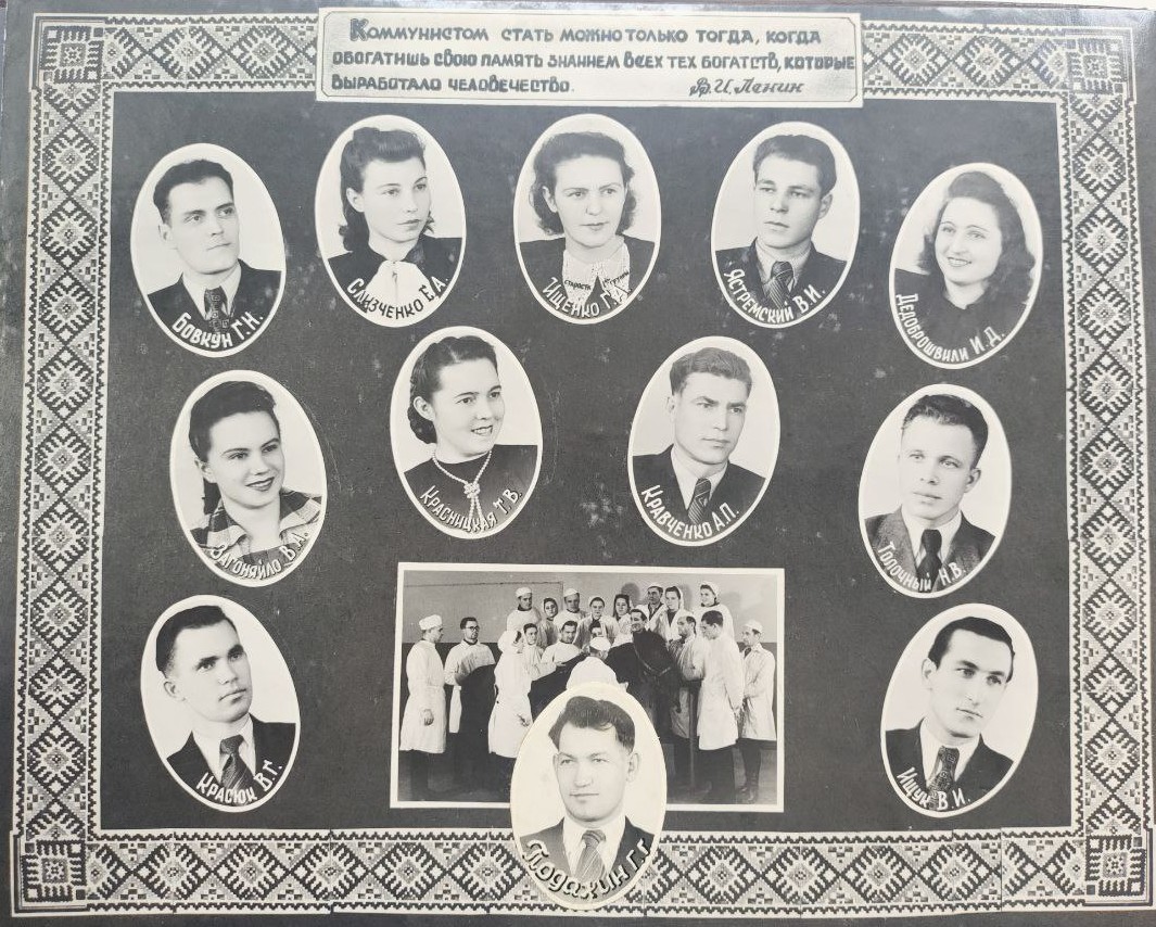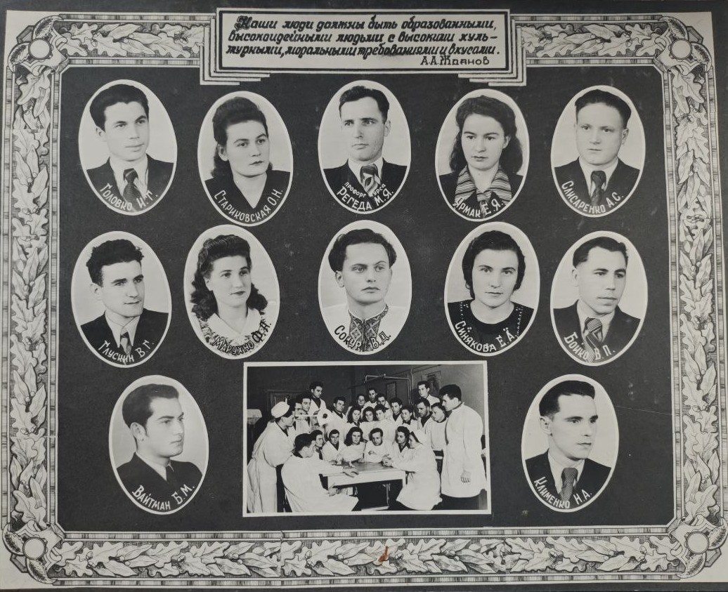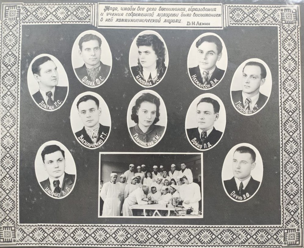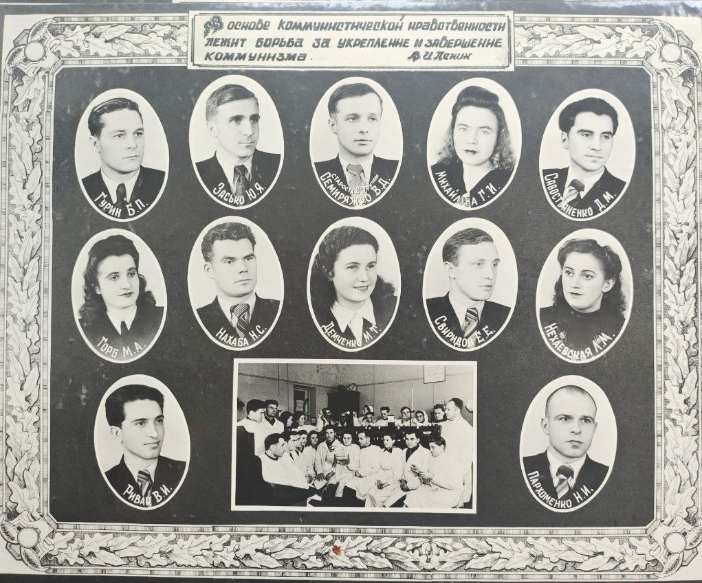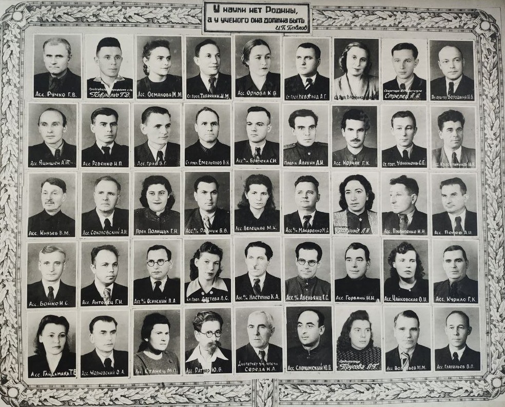(мова оригіналу: асс. Ручко Г.В., предс. профкома ин-та Гаврилко Г.Д., асс. Осмакова М.М., ст. преп. Табачник И.М., асс. Орлова К.В., ст. преп. Невзгляд Д.Г., ст. преп. Василькова С.Т., секр. комс. Стрелец А.А., врач ординатор Бородин И.В., асс. Яцишен А.И., асс. Ревенко И.П., асс. Грав З.Г., ст. преп. Емельянов В.К., асс. Братюка С.И., подполк. Алехин Д.И., асс. Корчак Г.К., ст. препод. Убийконь С.Е., асс. Красильников И.Н., асс. Князев В.М., асс. Соколовский Д.И., преп. Полищук Г.Н., асс. Радчук Б.В., асс. Белецкая М.К., асс. Макаренко М.Д., асс. Засидина Л.Н., асс. Пилипенко И.Н., асс. Попов Д.И., асс. Бойко И.С., асс. Антонець Г.И., асс. Осинський П.А., ст. преп. Дестева Л.С., асс. Нестенко К.А., асс. Абелянц Г.С., асс. Горбань Н.Н., асс. Чайковская О.И., асс. Курило Г.К., асс. Гайдамака Т.В., асс. Чорновский Ф.А., асс. Станец М.П., асс. Ратнер Ю.Б., диспетчер уч. части Середа Н.А., асс. Слонимский Ю.Б., ординатор Трусова Л.Г., асс. Вольяев М.М., асс. Глагольев Б.П.)