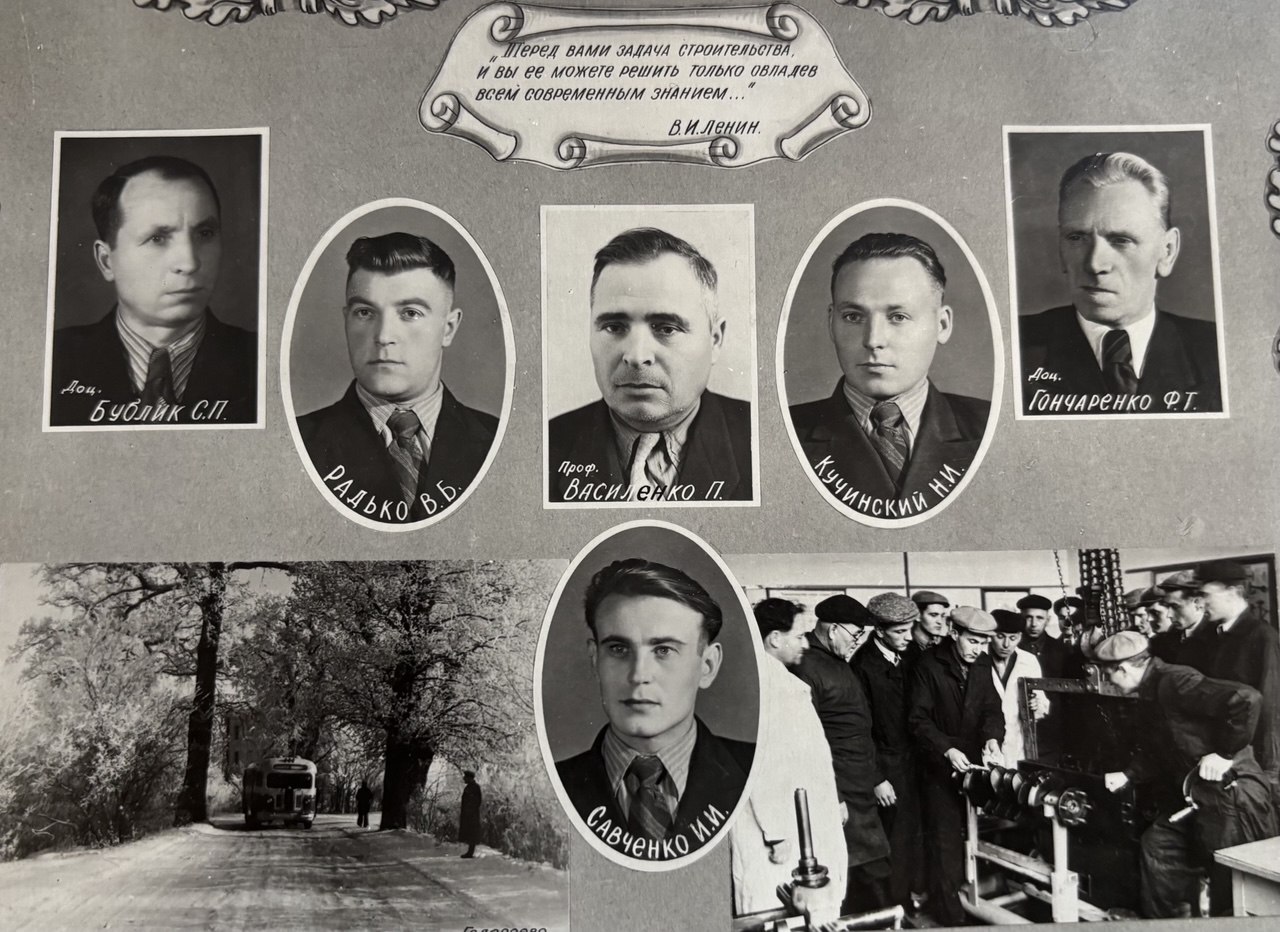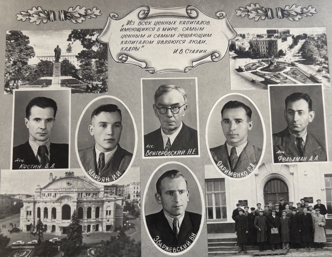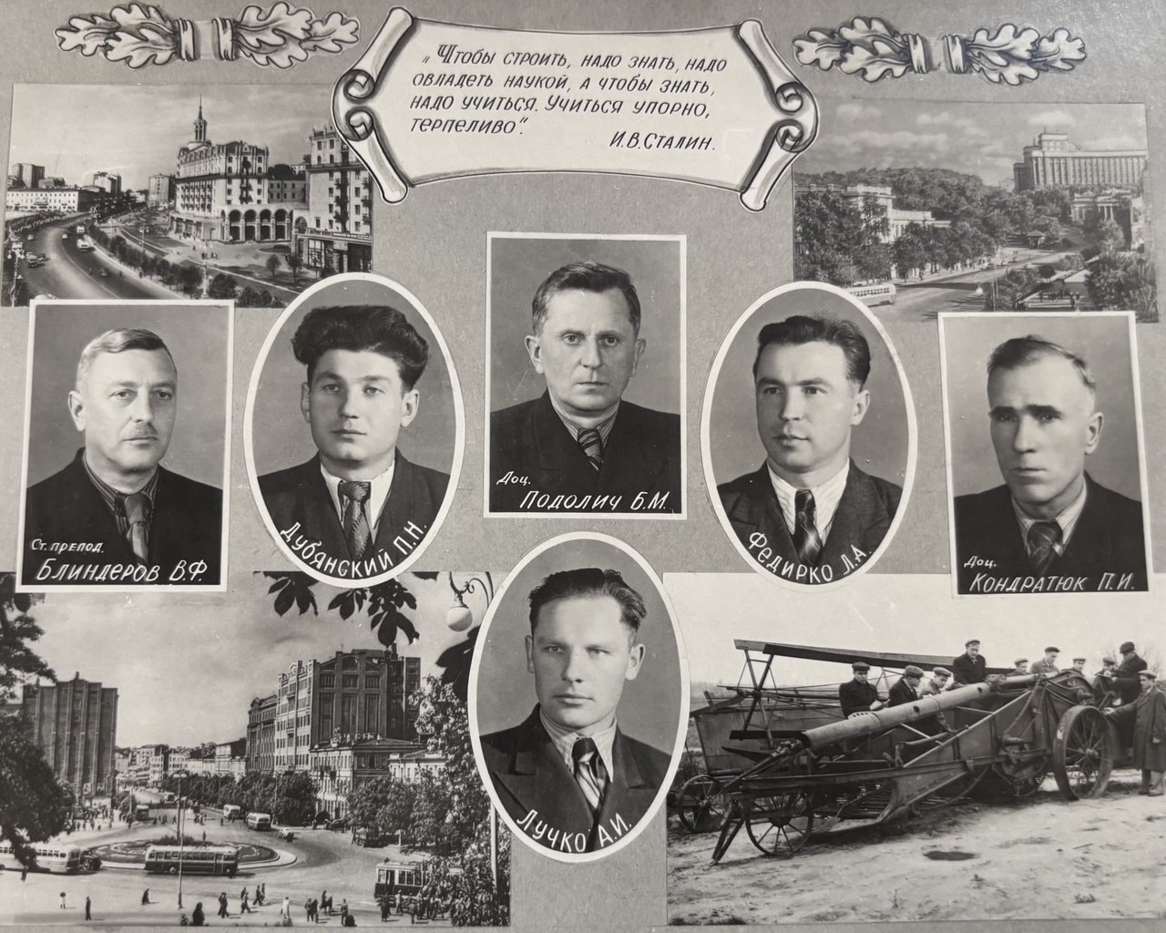 (мова оригіналу: проф. Чеботарев Р.С., акад. Касьяненко В.Г., зам. дире. ин-та по уч. части, проф. Безносенко А.Ю., дир. ин-та, проф. Лемишко П.М., секр. парт. орган. ин-та Василенко Д.Я., декан ин-та, доц. Борисевич В.И., проф. Чубарь В.К., проф. Вашетко Н.П., ген.-майор Полищук А.П., доц. Аветисьян А.А., зав. каф. марк.-лен., канд. ист. н. Гуменюк П.П., заслуж. деятель науки, проф. Поваженко И.Е., проф. Кравченко Н.А., проф. Скороходько А.К., доц. Нагорный И.С., доц. Баженов С.В., проф. Полянский М.А., член-кор АН, луреат Сталинской премии, проф. Гулый М.Ф., проф. Понамаренко М.Ф., проф. Слабоспицкий Т.П., доц. Дмитриев К.И., доц. Братюха С.И., доц. Настенко К.А., доц. Гиммельрейх Г.А., доц. Волкобой М.Ф., канд. н. Радчук Б.В.)