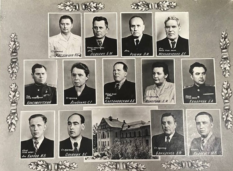нач. каф., ген.-майор Шакін І. С., заст. директора з наук. частини Гусєв В. І., директор ін-ту Шитов І. М., декан л.-м. ф-ту Гурмаза А. М., полковник Каргавенко А. М., директор НДІП, лауреат Сталінської премії, канд. с.-г. наук Дука С. Х., секретар партбюро Кальной П. Г., заст. директора з АГЧ Мироненко В. І., зав. каф., проф. Бодров В. А., доц. Миловидов А. М., доц. Полубояринов І. Й., ст. викл. Погорєлова Л. В., зав. каф. Адамов І. Г., доц. Кубишкін П. П., асист. Падій Н. М., ст. викл. Сазонов І. М.