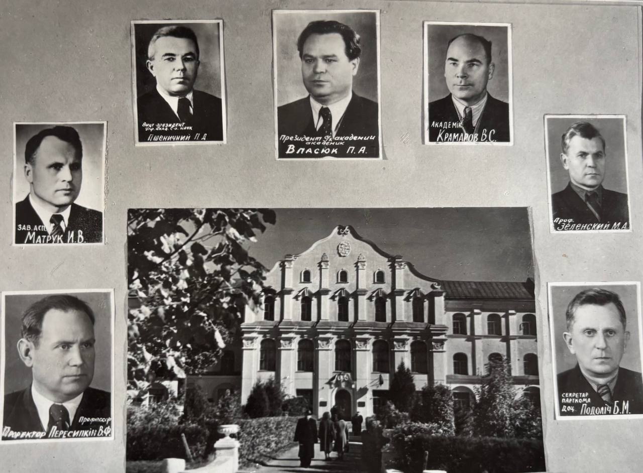 Мова оригіналу: проректор Пересипкін В.Ф., зав. асп. Мартук И.В., вице-президент укр. акад. с.-х. наук Пшеничний П.Д., президент Ук. академии академик Власюк П.А., академік Крамаров В.С., проф. Зеленский М.А., секретар парткома доц. Подоліч Б.М.