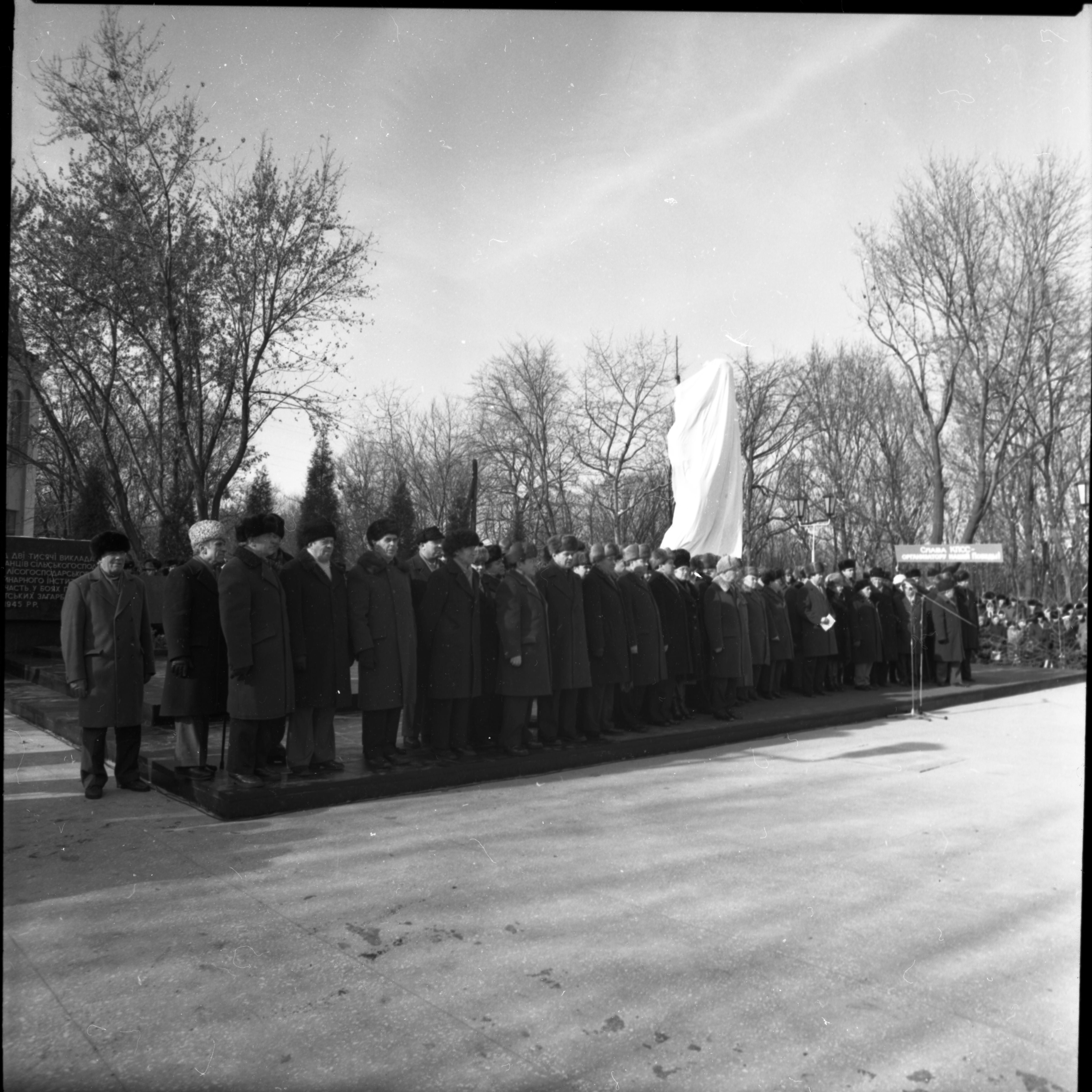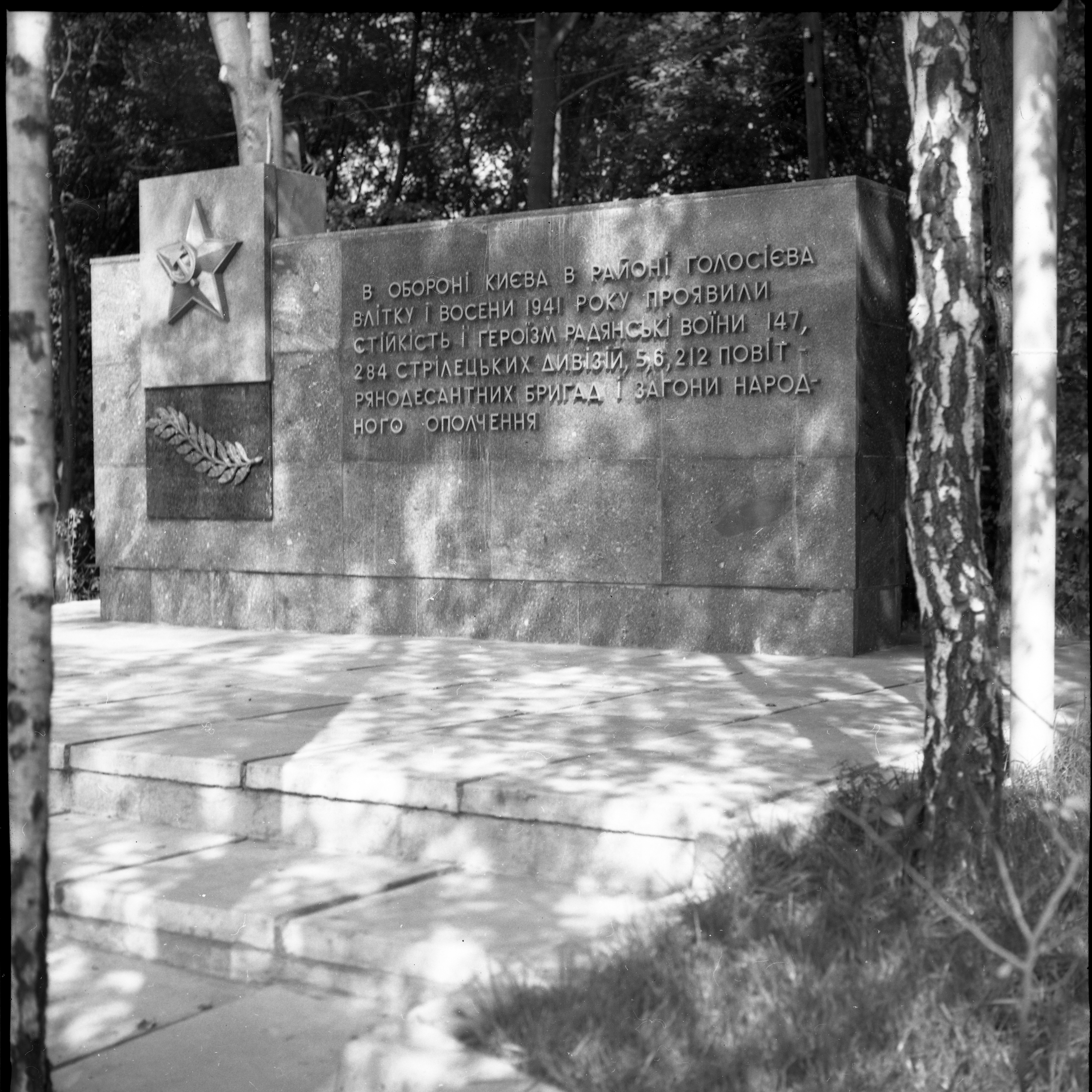 1979 рік, 6 листопада. На місці спільного поховання воїнів-захисників Києва 1941 р. було зведено меморіальний комплекс. Прізвища 79 захисників Голосієво (серед них дві жінки?) занесені на стелу меморіального комплексу. Центральна фігура меморіалу – символічна бронзова скульптура студента голосіївських інститутів, який у червні-серпні 1941 р. вступив до лав захисників. Скульптурна постать меморіалу, обрана скульптором Я. Гончаренком та архітектором В. Гнездиловим, має своїм прообразом студента 3 курсу Київського сільськогосподарського інституту Миколу Скибу.