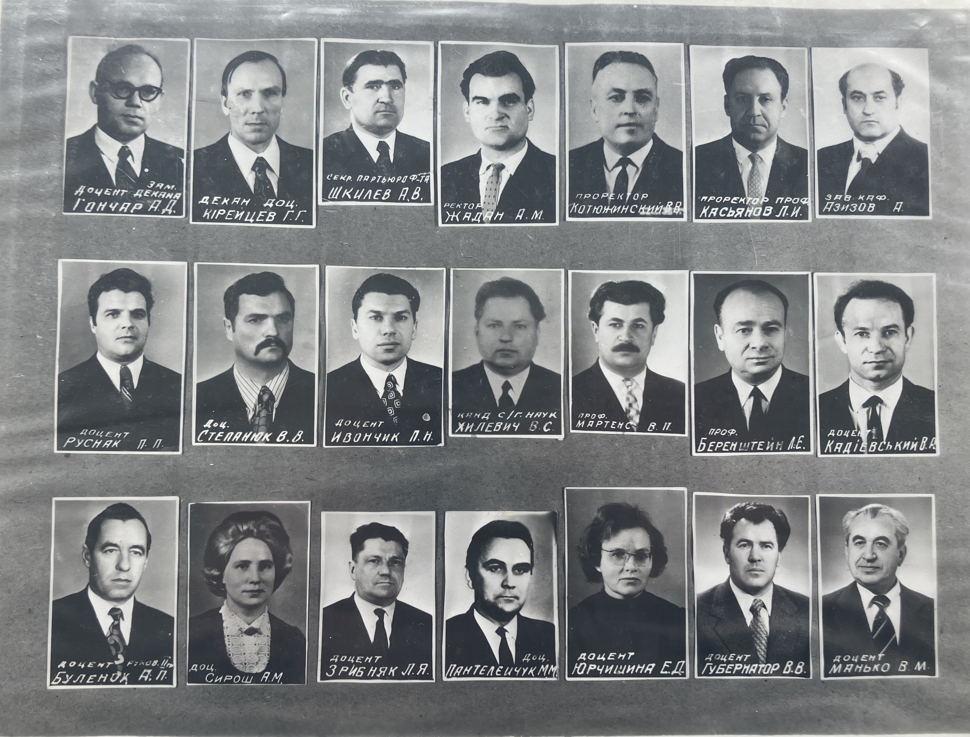 1. доцент зам. декана Гончар А.Д., декан. доц. Кірейцев Г.Г., секр. партьюро ф-та Шкилев А.В., ректор Жадан А.М., проректор Котюжинский В.В., проректор проф. Касьянов Л.И., зав. каф. Азизов А., доцент Русняк П.П., доц. Степанюк В.В., доцент Ивончик П.Н., канд с/г наук Хилевич В.С., проф. Мартенс В.П., проф. Беренштейн Л.Е., доцент Кадіевський В.Р., доцент руков. ІІ гр Буленок Д.П., доц. Сирош А.М., доцент Зрибняк Л.Я., доц. Пантелейчук М.М., доцент Юрчишина Е.Д., доцент Губернатор В.В., доцент Манько В.М.