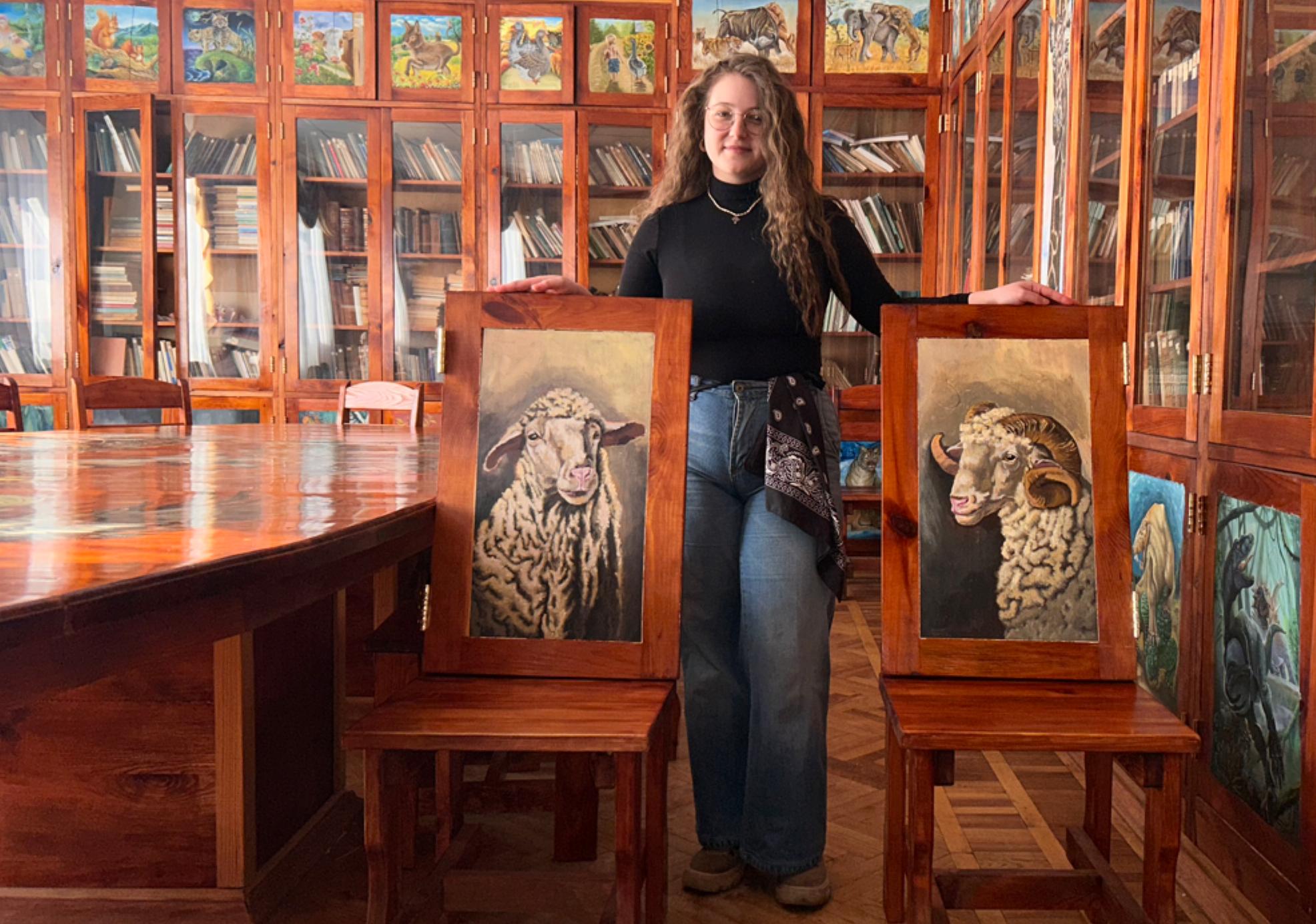 19 лютого 2026 року. Продовжуємо художнє оформлення кафедральної бібліотеки. Студентка Ольга Кравець та її роботи для нашої бібліотеки