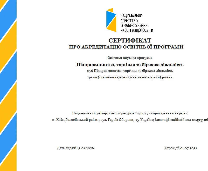 Кваліфікація: доктор філософії підприємництва, торгівлі та біржової діяльності (денна)