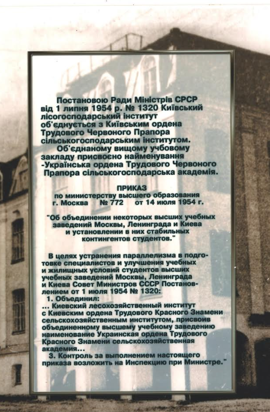 1954 р. – Українська ордена Трудового Червоного Прапора сільськогосподарська академія (Постанова Ради Міністрів СРСР від 1 липня 1954 р. № 1320 Київський лісогосподарський інститут об’єднується з Київським ордена Трудового Червоного Прапора сільськогосподарським інститутом. Об’єднаному вищому навчальному закладу присвоєно найменування Українська ордена Трудового Червоного Прапора сільськогосподарська академія).