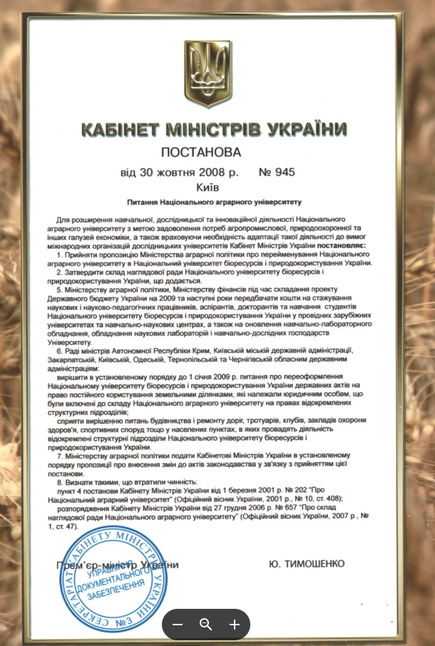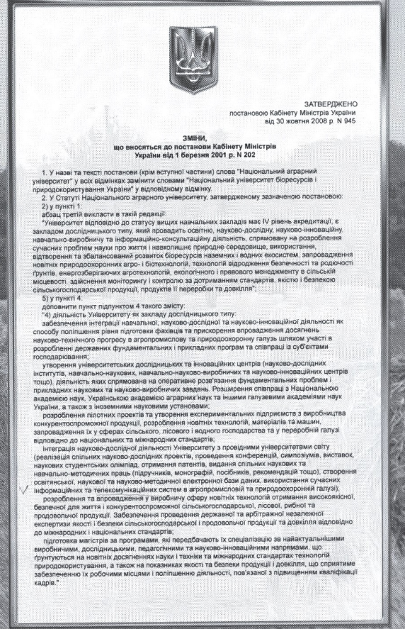 2008 рік – Національний університет біоресурсів та природокористування України (Постанова Кабінету Міністрів України від 30 жовтня 2008 року № 945 про перейменування Національного аграрного університету в Національний університет біоресурсів та природокористування України).