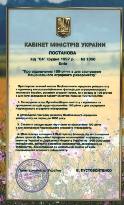 1997 рік - "Про відзначення 100-річчя з дня засування Національного аграрного університету" (Постанова Кабінету Міністрів України від 1 червня 1997 р. № 1356).
