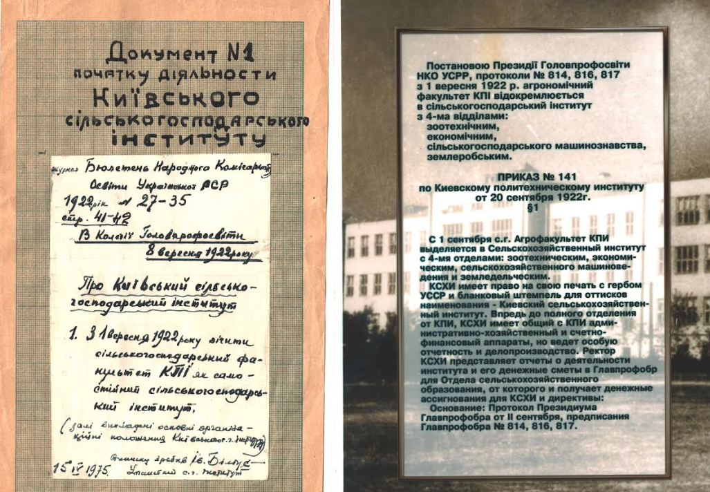 1918 рік – сільськогосподарське відділення КПІ було перетворене у агрономічний факультет (Проєкт Закону про «Київську сільськогосподарську академію». Проєкт. За підписом міністра земельних справ М.М. Ковалевського).