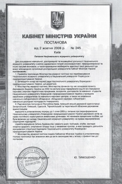 2008 рік – Національний університет біоресурсів та природокористування України (Постанова Кабінету Міністрів України від 2 жовтня 2008 року № 245 про перейменування Національного аграрного університету в Національний університет біоресурсів та природокористування України).