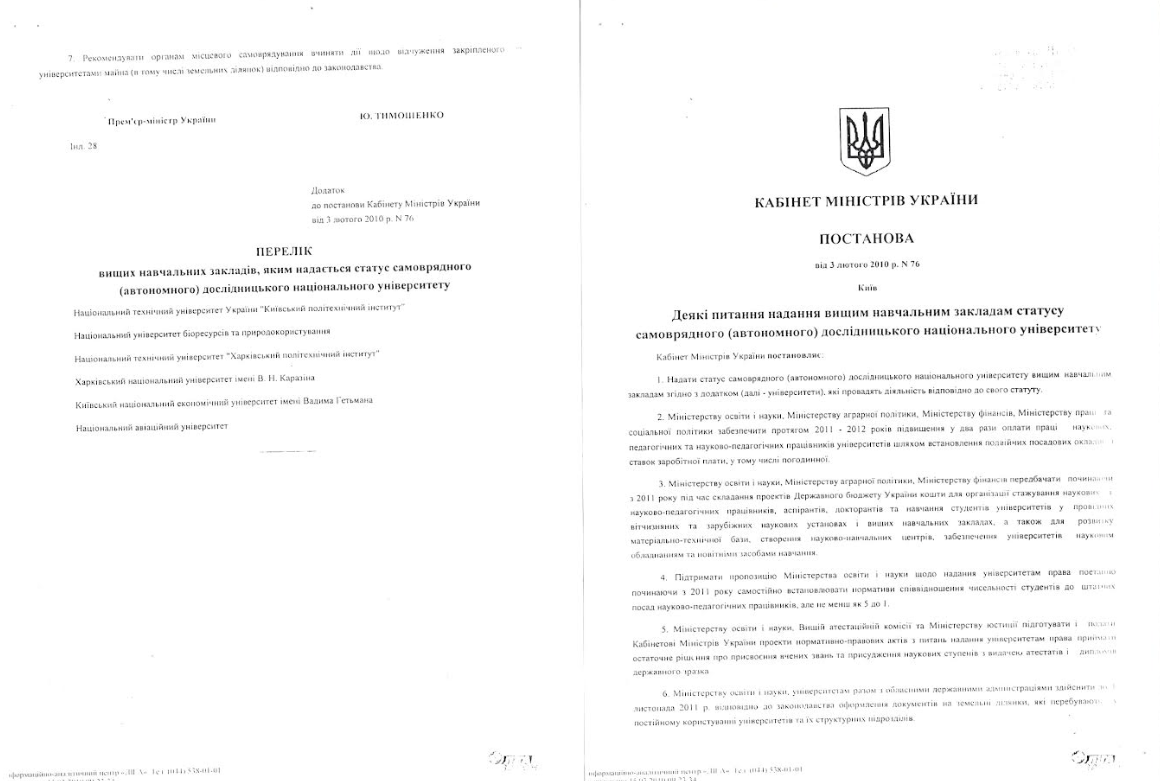 2010 рік – Надання Національному університету біоресурсів та природокористування України статусу самоврядного (автономного) дослідницького національного університету (Постанова Кабінету Міністрів України від 3 лютого 2010 року № 760.