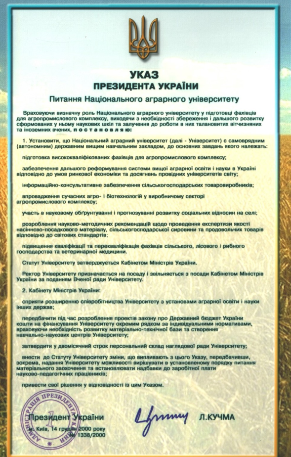 2000 рік - Національний аграрний університет - самоврядний (автономний)державний вищий навчальний заклад (Указ Президента України від 14 грудня 2000 року № 1338/2000).
